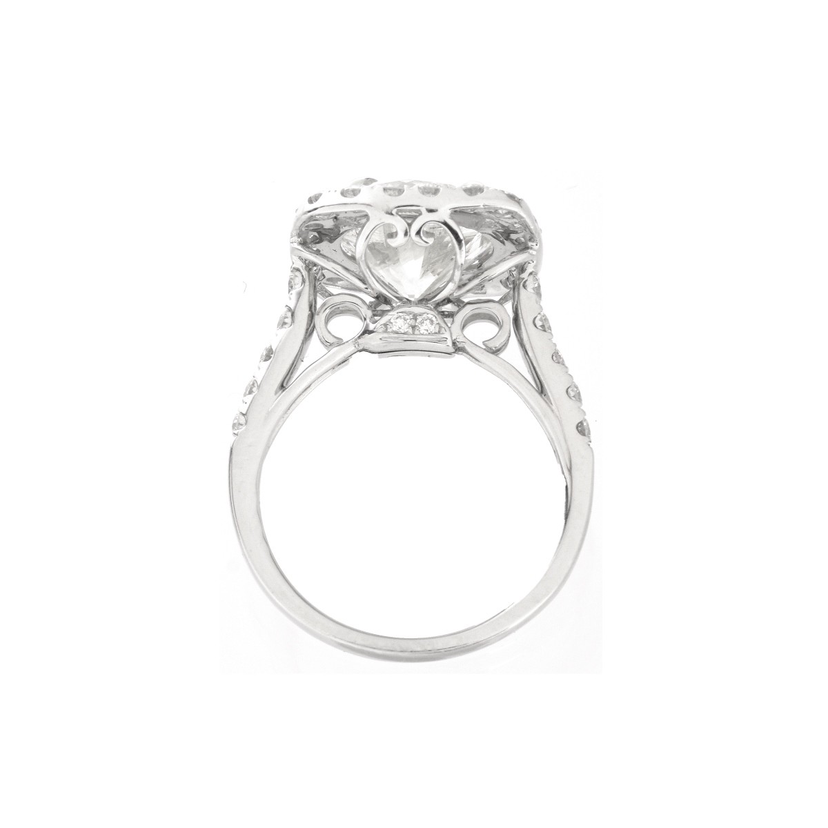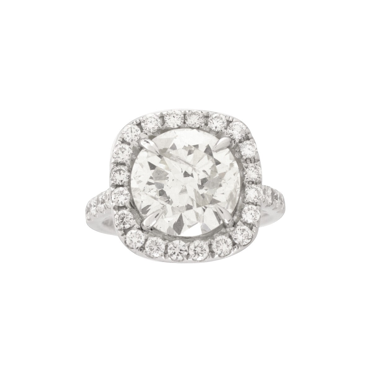 Approx. 4.28 Carat Round Brilliant Cut Diamond and 18 Karat White Gold Engagement Ring. Center diamond I-J color, SI2 clarity. Accented with round brilliant cut diamonds, F-G color, VS clarity. Stamped 18K 750. Ring size 6-1/2. Approx. weight: 5.7 grams. Condition: Very good condition. Estimate: $18000.00 - $25000.00 Domestic Shipping: $28.00