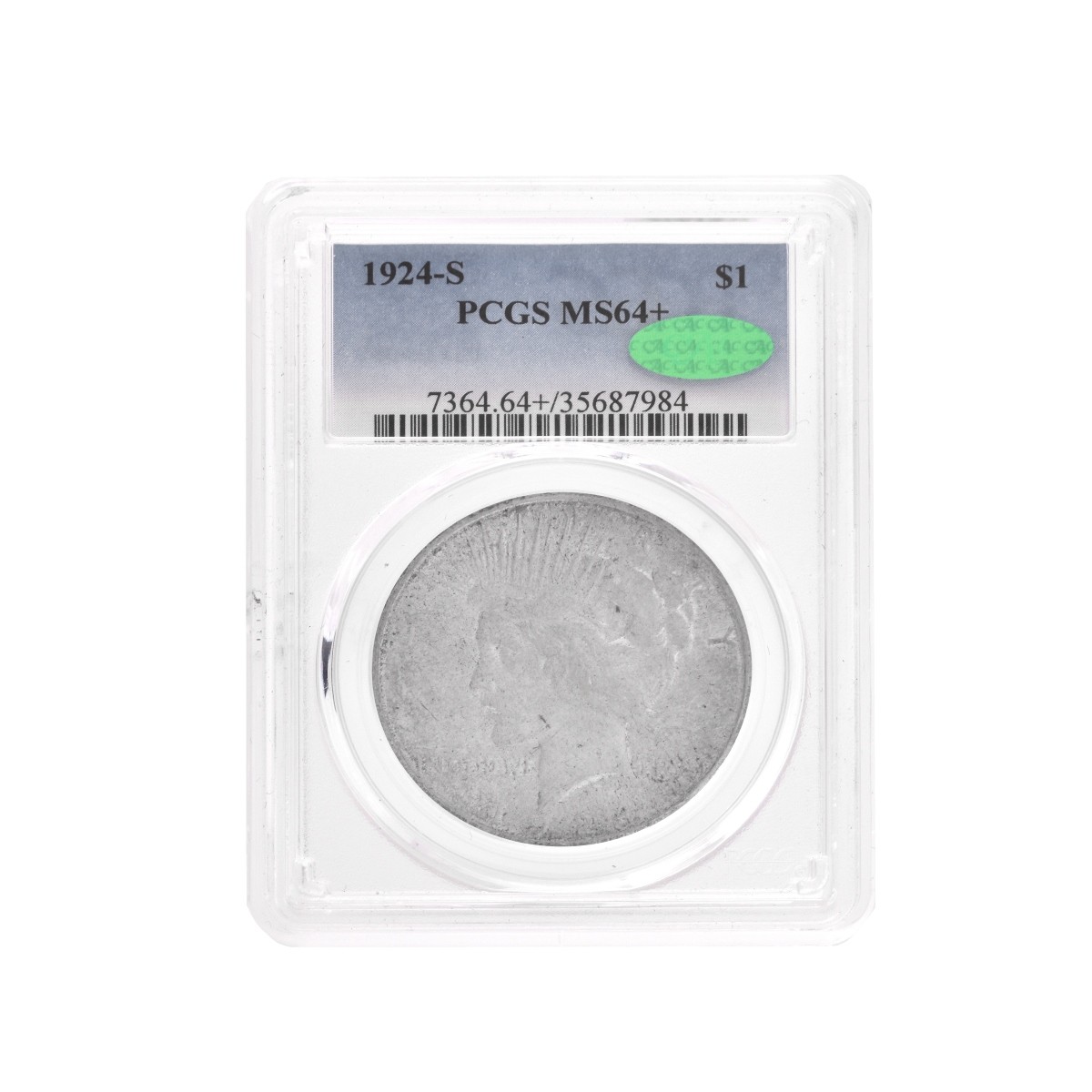 1924-S Peace Silver Dollar in Slabbed Case. Reverse: bust facing left. Obverse: perched eagle. Designer: Anthony de Francisci. Size: 38.1mm. Weighs: 26.73 grams. Condition: PCGS MS-64+ Estimate: $100.00 - $1500.00 Domestic Shipping: $28.00