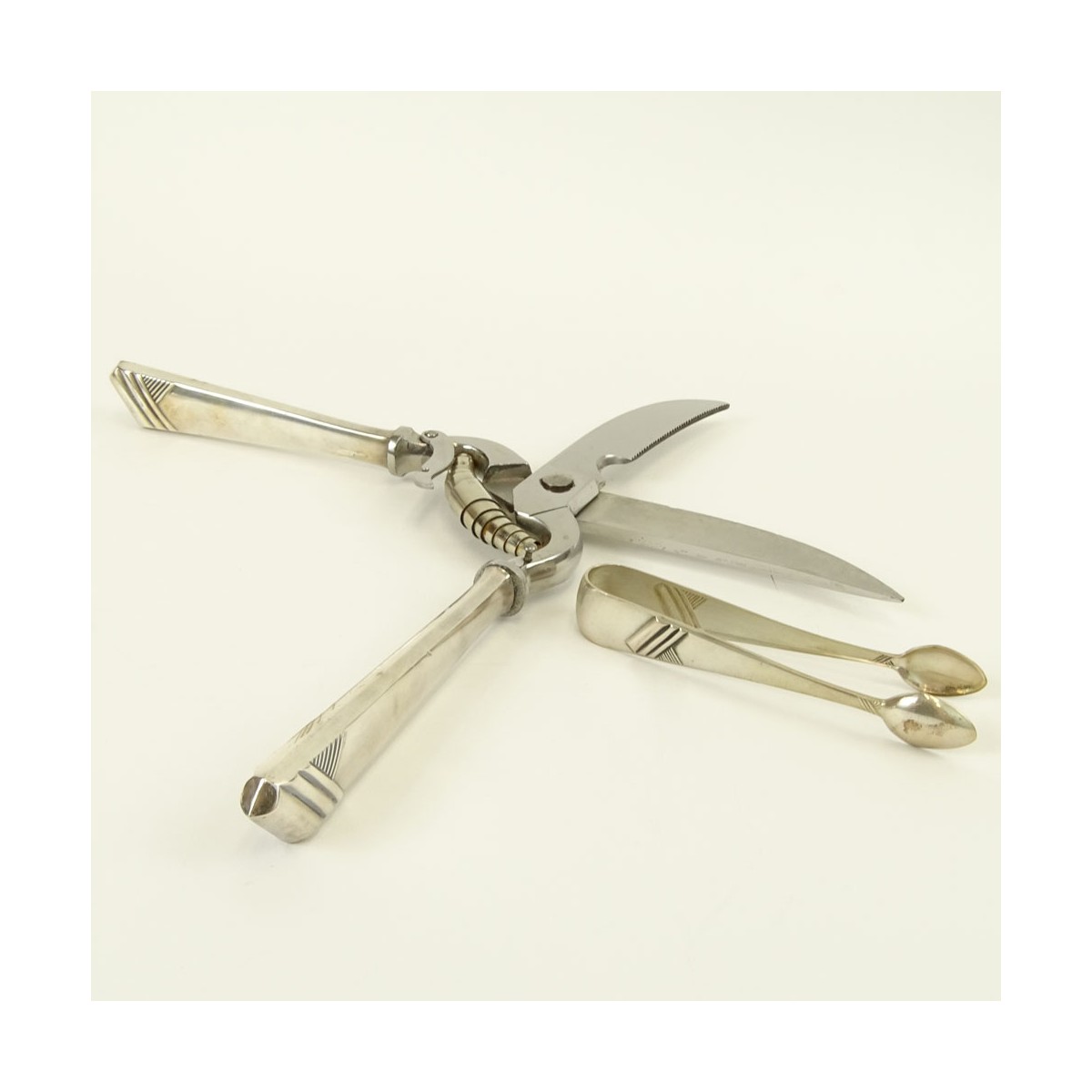 Impressive 182 Piece Set of OKA Kaldenback Sterling Silver Flatware in Custom Wood Chest. The set includes 12 dinner forks, 8-1/4", 12 dinner knives, 12 large spoons; 12 place spoons; 12 lunch forks; 12 lunch knives; 12 fish forks; 12 fish knives; 12 fruit spoons; 12 fruit forks; 12 fruit knives; 12 teaspoons; 12 demitasse spoons; 12 butter spreaders. 14 serving pieces include: poultry shears; large fish knife; small fish knife; carving knife and fork; pie server, large serving spoon; master butter; meat fork, salad serving spoon, salad serving fork; tongs; large ladle, small ladle. Assembled knives, shears, carving set with stainless implements signed Rostfrei. The solid sterling pieces signed. OKA STERLING 925. Large multi drawer wood chest included. Approximate weight of solid sterling pieces is 175.78 troy ounces, knives and serving pieces with sterling handles weigh approximately 106.57 troy ounces. Condition: Good condition, wear consistent with age and history, light scratching, needs a polish. Estimate: $4000.00 - $6000.00 Domestic Shipping: Third party.