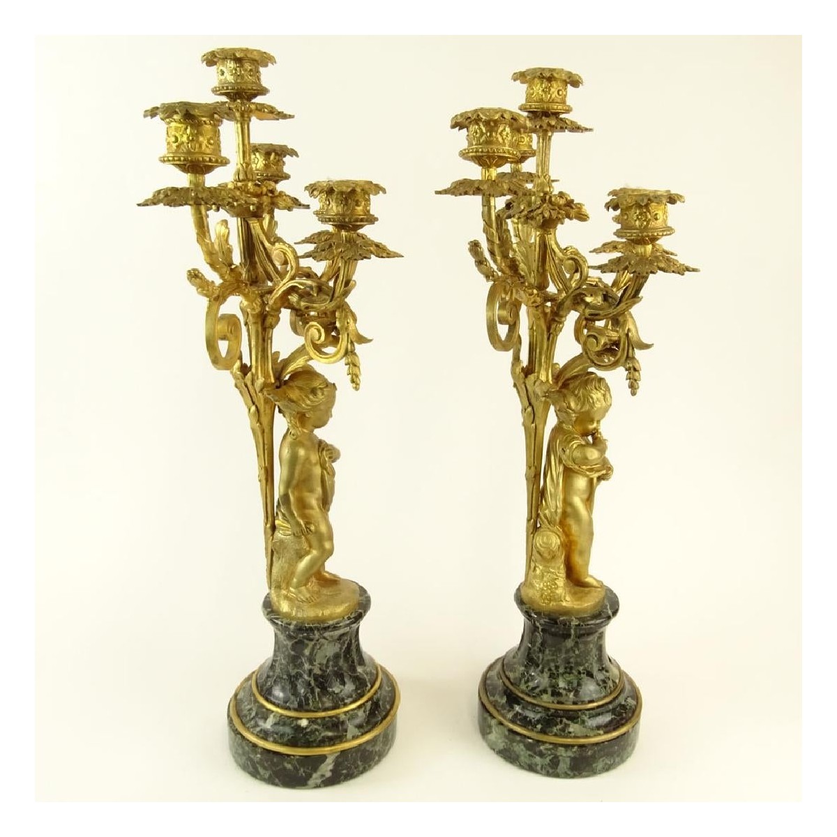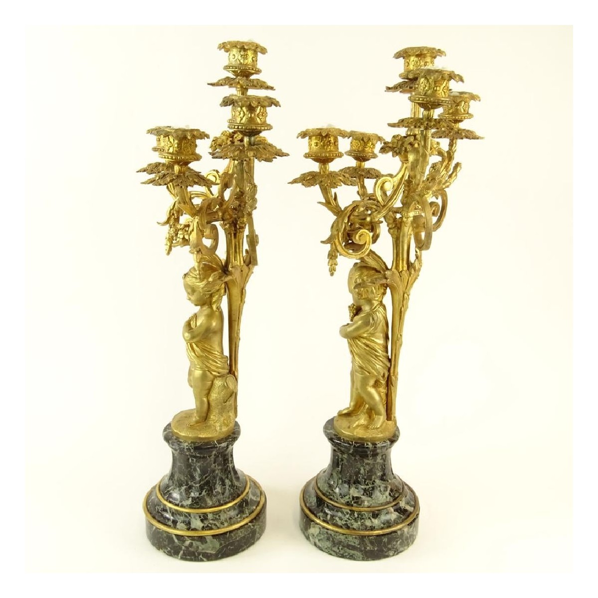Early 20th Century Neoclassical Style Gilt Metal and Serpentine Marble Five Light Candelabra. Unsigned. Measure 23" H, 12-1/2 " W. Condition: One arm broken has been repaired otherwise Good condition. Estimate: $400.00 - $600.00 Domestic Shipping: Third party