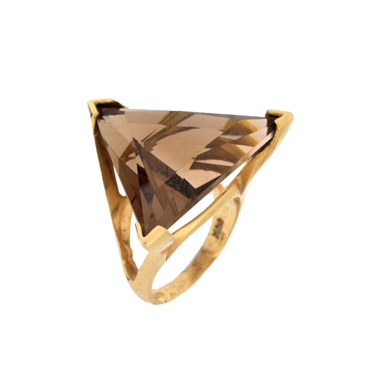 Vintage Contemporary Design Triangular Shape Smokey Quartz and 14 Karat Yellow Gold Ring. Quartz measures 22mm x 22mm. Stamped 14K. Ring size 6-3/4. Approx. weight: 9.6 grams. Condition: Good vintage condition. Light wear to gold. Estimate: $200.00 - $400.00 Domestic Shipping: $28.00