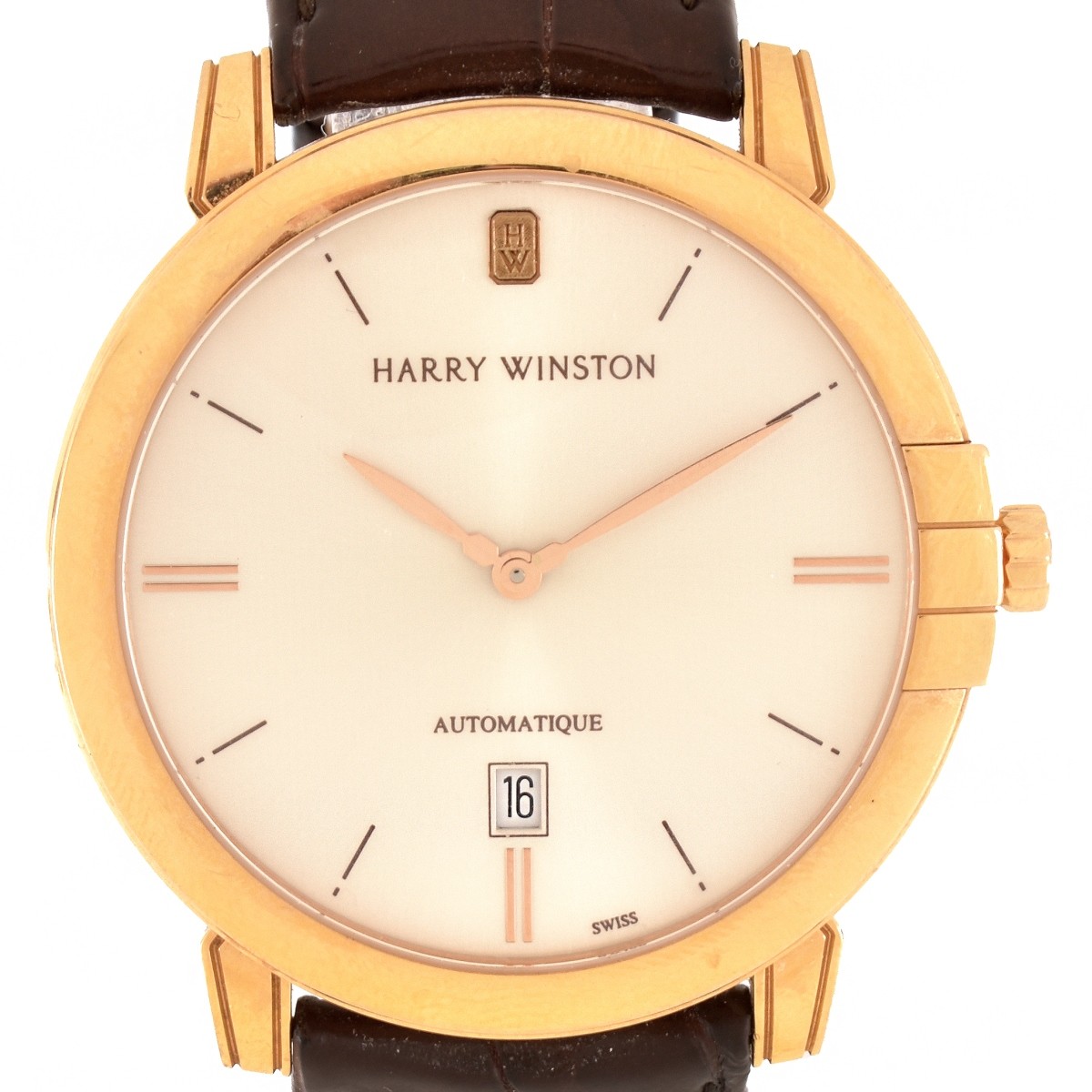 Harry Winston Midnight 42mm 450-MA42R 18 Karat Rose Gold Watch with Silver Dial, Date, Automatic Movement and Alligator Strap with 18 Karat Rose Gold Buckle. Signed and numbered 218, stamped 750. Strap measures 9-3/8" L. Approx weight: 78.1 grams. Condition: Good condition. Running. Light surface wear / scratches. Wear to strap. Please note the gallery does not warranty the running condition of watches. Estimate: $10000.00 - $15000.00 Domestic Shipping: $32.00