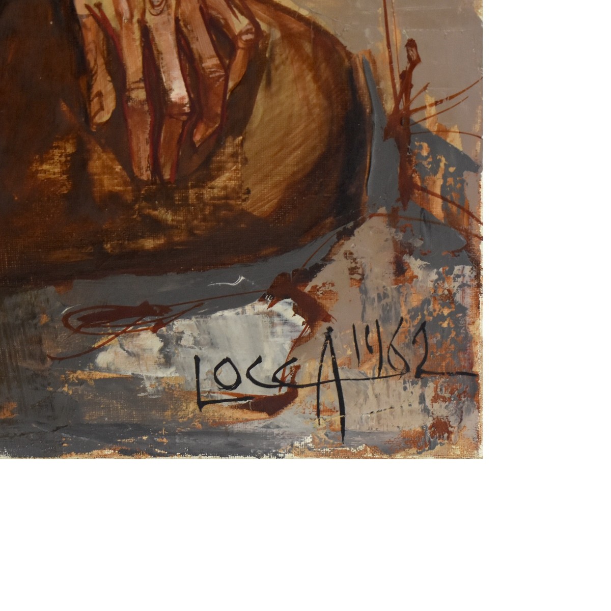Albert Locca, Swiss (1895 - 1966) Oil on Canvas, Male Figure Seated in Outdoor Scene, Signed and Dated 1962 Lower Right. Unframed. Measures 28-1/2" H x 23-1/2" W. Condition: Craquelure, small area of paint loss and fine puncture to the canvas Estimate: $150.00 - $250.00 Domestic Shipping: $145.00