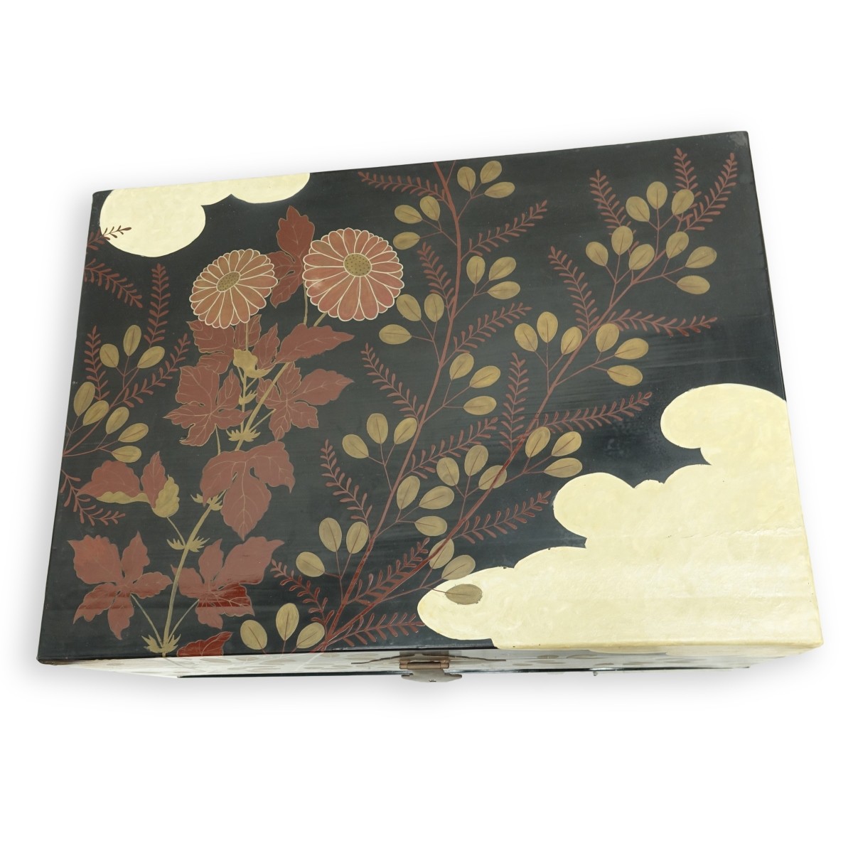 Pair of Mid Century Japanese Black Lacquered Trunks on Wooden Stands. Unmarked. Measures 15" H x 30" W x 21-1/2" D, stand measures 4" H x 30-1/2" W x 23-3/4" D. Condition: Some rubbing to lacquer, scuffs Estimate: $200.00 - $400.00 Domestic Shipping: Third party