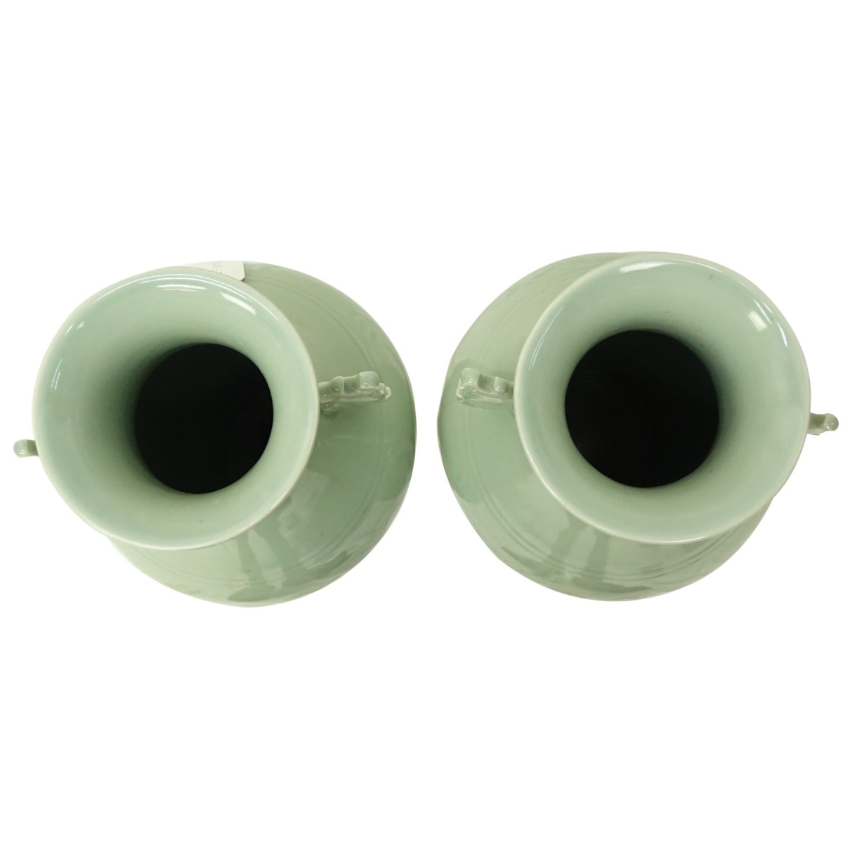 Pair of Tall Chinese Longquay Style Celadon Porcelain Vases. Signed. Baluster form with blossom motif. Measures 17" H x 7-1/4" W. Condition: Good condition Estimate: $100.00 - $300.00 Domestic Shipping: third party