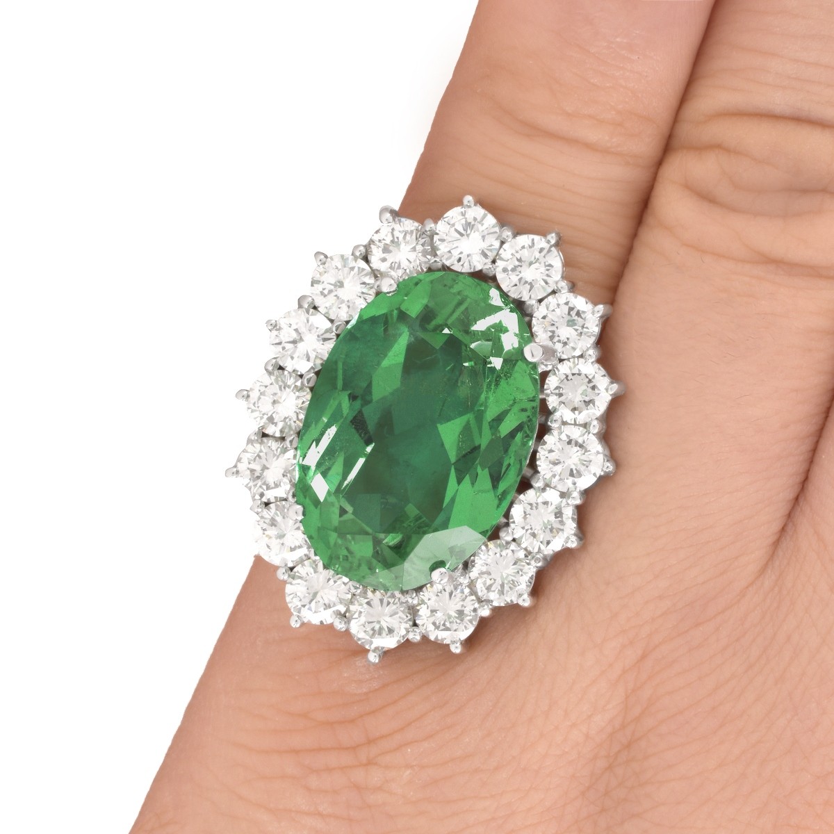 GIA Certified 24.13 Carat Oval Cut Colombian Emerald, 6.25 Carat TW Sixteen Round Brilliant Cut Diamond and 18 Karat White Gold Ring. Emerald with vivid color. Diamonds E-G color, VVS-VS clarity. Unsigned. Ring size 6-1/2. Approx. weight: 25.70 grams. GIA Report 2201374949 dated 6/19/19 to accompany this lot. Condition: Very good condition. Estimate: $50000.00 - $60000.00 Domestic Shipping: $30.00