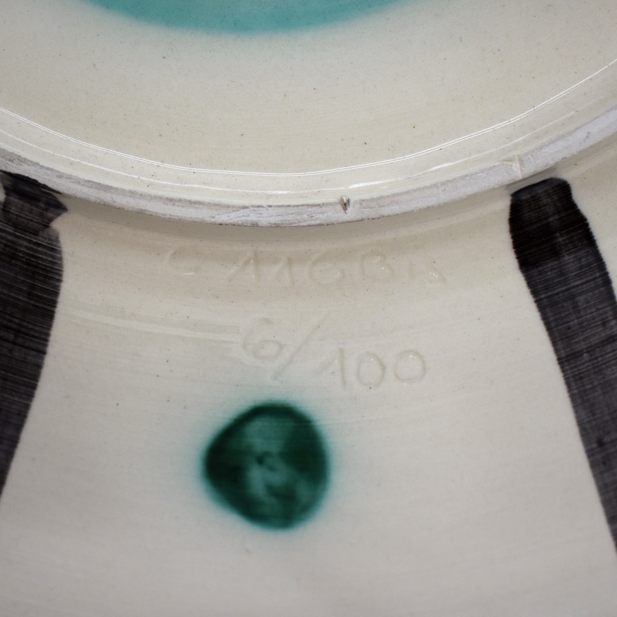 Pablo Picasso, Spanish (1881 - 1973), 1956 "Face with Palm Leaves / Bright Mask" (reverse). White earthenware round dish, reverse painted green and black decoration in engobes under glaze. Alain Ramie 365/366. Numbered 6/100 and incised C116Bis. Madoura Plein Feu and Empriente Originale De Picasso pottery marks. Measures 16.5" / 42cm diameter. Frame measures 30-3/4" H, 31" W. Condition: Very good condition. No condition issues. The dish has been custom framed to display the reverse of the dish and we have not examined it out of the frame. Estimate: $10000.00 - $15000.00 Domestic Shipping: Third Party