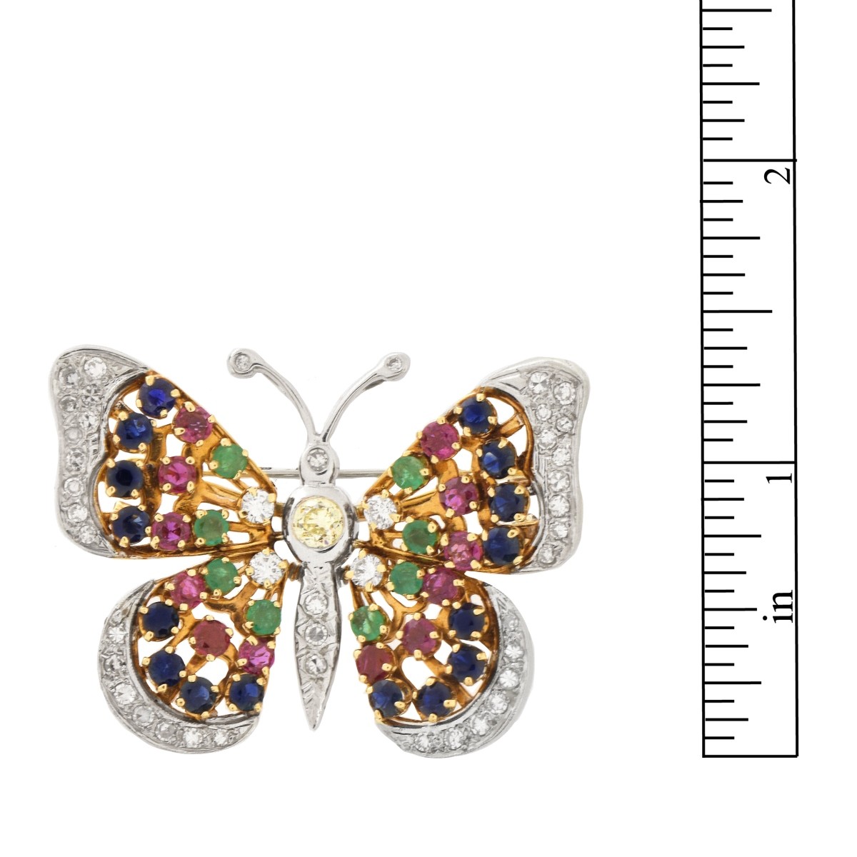 Vintage Round Brilliant Cut Diamond, Round Cut Multi Gemstone and 14 Karat Yellow and White Butterfly Trembleuse Brooch. Gem quality stones throughout include diamonds, rubies, sapphires and emeralds. Measures 1-3/8" H, 1-3/4" W. Approx. weight: 21.1 grams. Condition: Very good condition. Estimate: $600.00 - $800.00 Domestic Shipping: $30.00