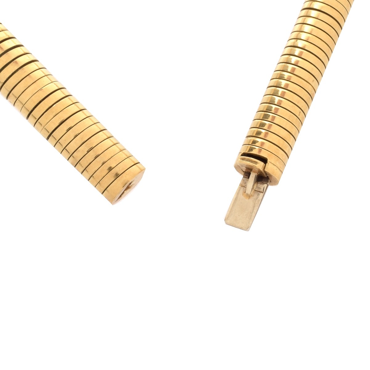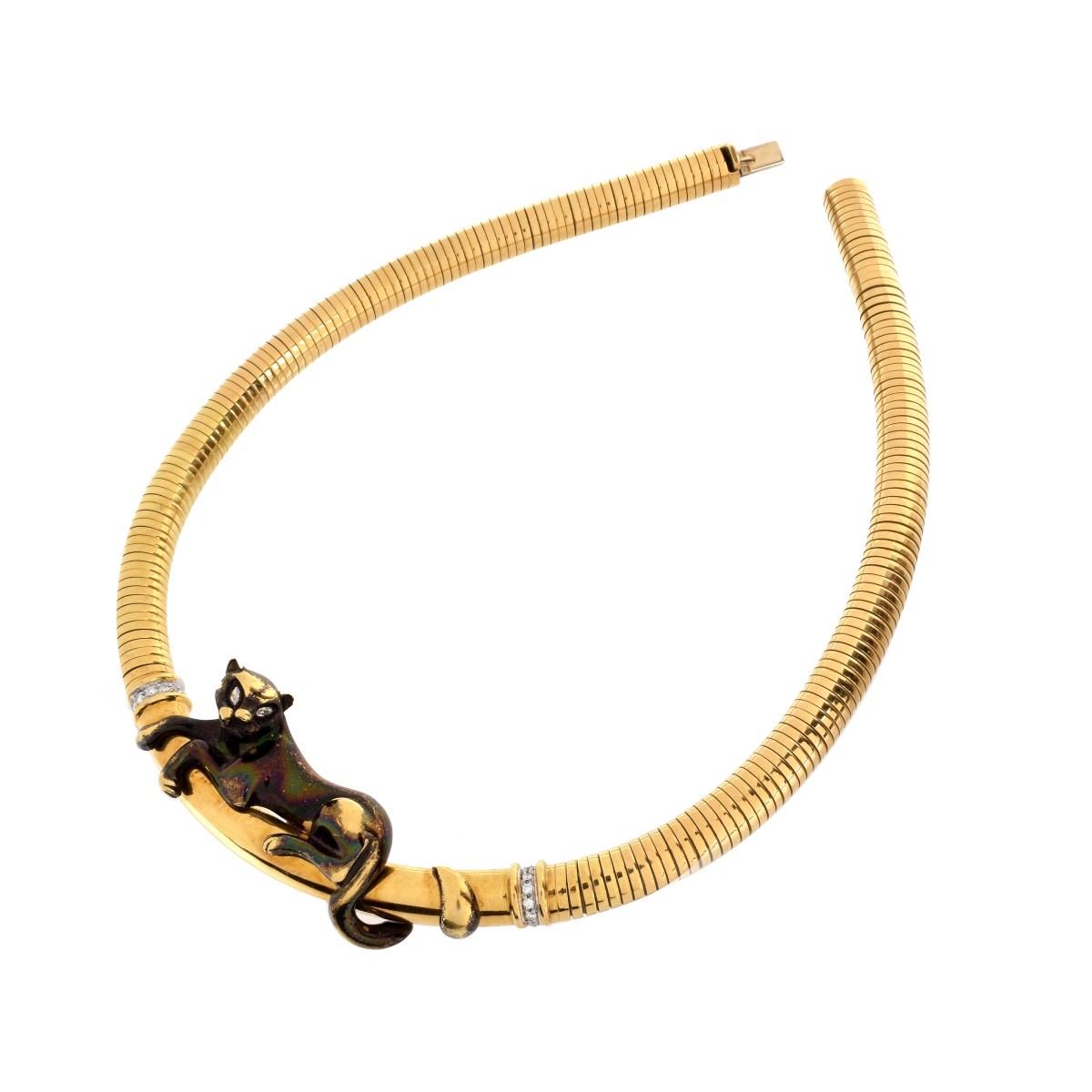 Vintage Diamond and 18 Karat Yellow Gold Panther Stretch Link Necklace set with Round Brilliant and Marquise Cut Diamonds. Diamonds E-F color, VS1-VS2 clarity. Signed, stamped 18K. Measures 17" L, 1" W. Approx. weight: 67.3 dwt. Condition: Very good vintage condition. Estimate: $4000.00 - $6000.00 Domestic Shipping: $32.00
