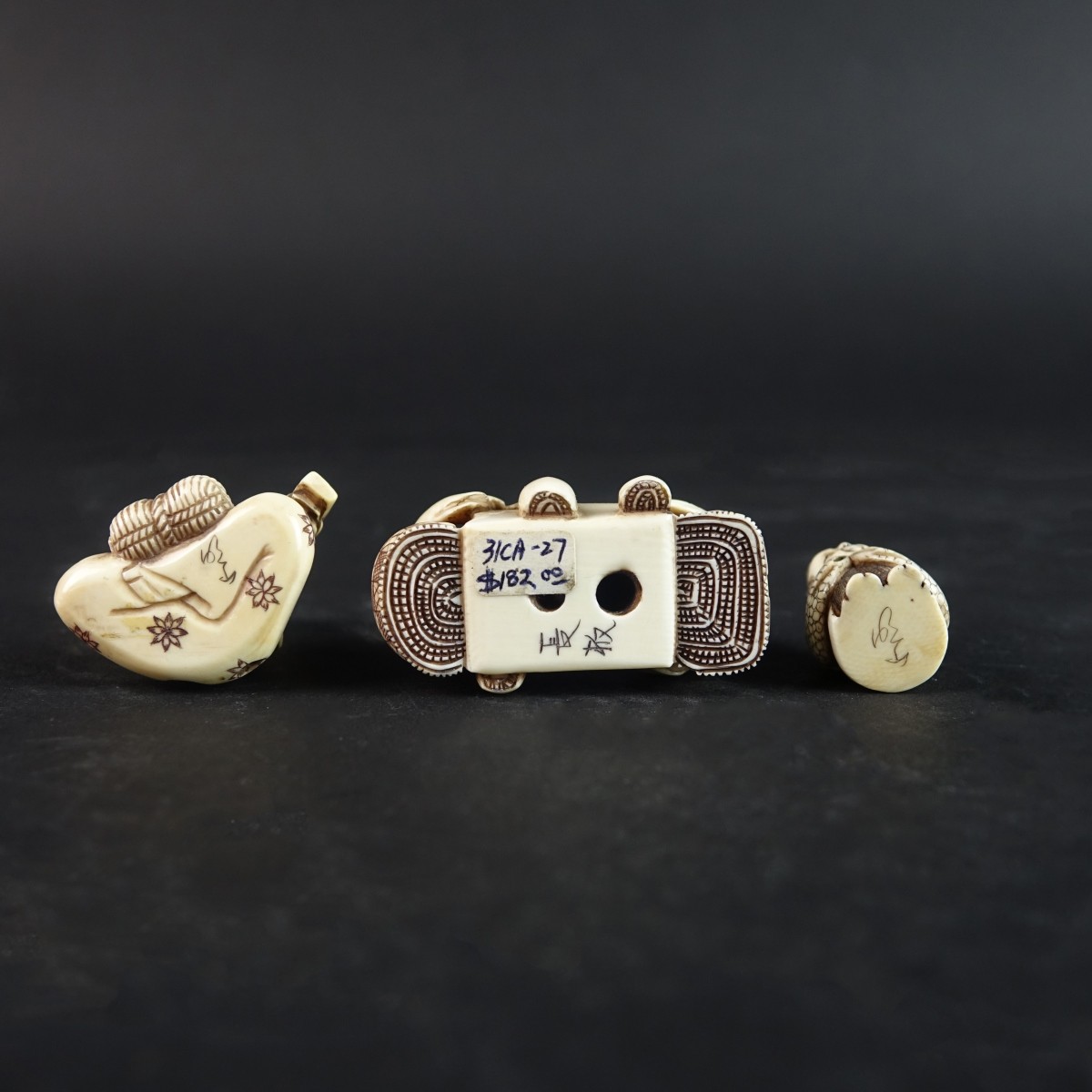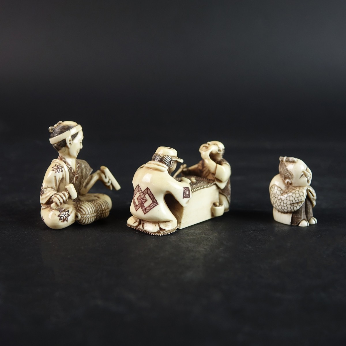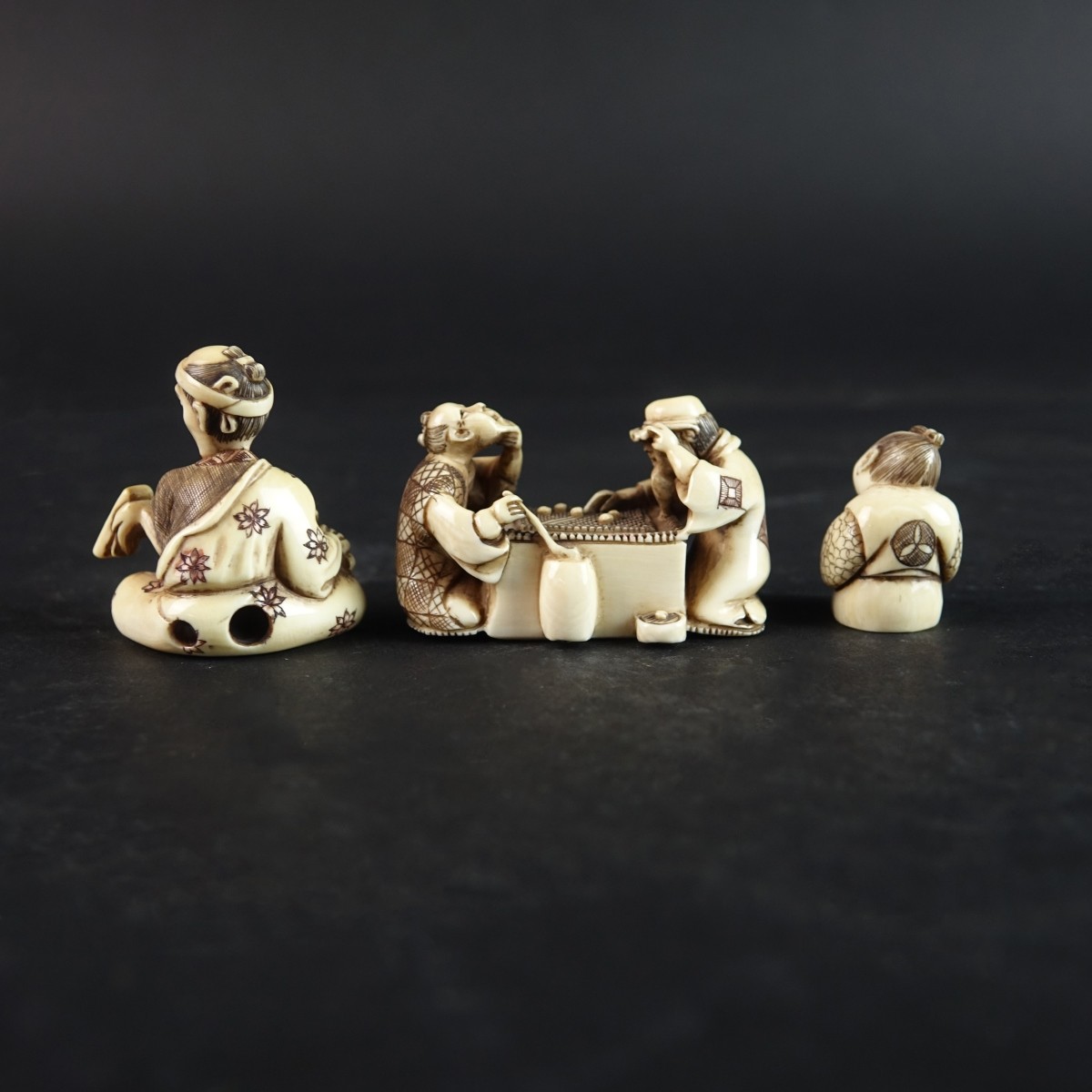 Grouping of Three (3) Antique Japanese Polychrome Carved Netsukes. Signed. Seishi Go game, along with two seated figures. Tallest measures 1-1/2" H, smallest measures 1-1/8" H. We Will Not Ship This Item Out of State of Florida. Anyone Having This Item Shipped Must Have a Florida Address or the Item will not be Shipped. We will Not Knowingly Sell Endangered Species outside of Legal Channels. Condition: Good condition Estimate: $50.00 - $150.00 Domestic Shipping: $32.00