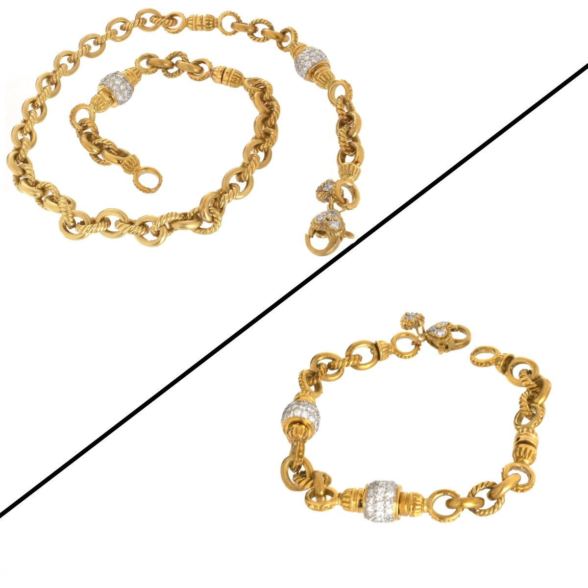 Vintage Approx. 1.50 Carat TW Pave Set Round Brilliant Cut Diamond and 18 Karat Yellow Gold Necklace with Coverts to Bracelet. Diamonds G-H color, VS1 clarity. Necklace measures 18-3/4" L, 3/8" W; as bracelet measures 8-1/2" L. Approx. weight: 89.7 grams. Condition: Very good vintage condition. Estimate: $4000.00 - $6000.00 Domestic Shipping: $30.00