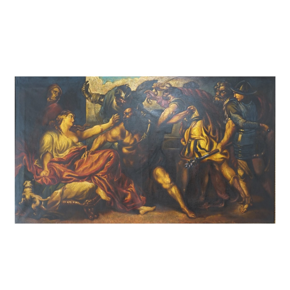 After: Anthony Van Dyck, Flemish (1599 - 1641) Palace Size 19th Century Oil on Canvas "Sampson and Delilah" Unsigned. Measures 44-1/2" H x 78-1/2" W, frame measures 55-1/2" H x 89-1/2" W. Condition: Restorations to the canvas, conserved condition Estimate: $2000.00 - $4000.00 Domestic Shipping: Third party