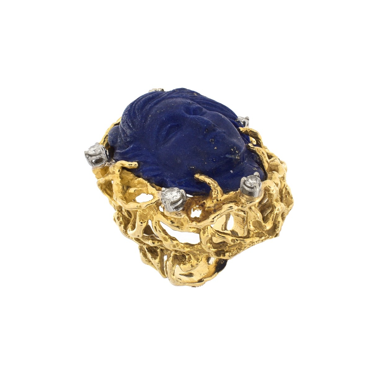 Vintage Large Carved Lapis Lazuli Cameo, Approx. .50 Carat TW Round Brilliant Cut Diamond and 14 Karat Yellow Gold Ring. Diamonds F-G color, VS1-SI1 clarity. Stamped 14K. Ring size 6. Ring top measures 1-1/2" x 1-1/4". Approx. weight: 34.9 grams. Condition: Very good condition. Estimate: $600.00 - $800.00 Domestic Shipping: $28.00