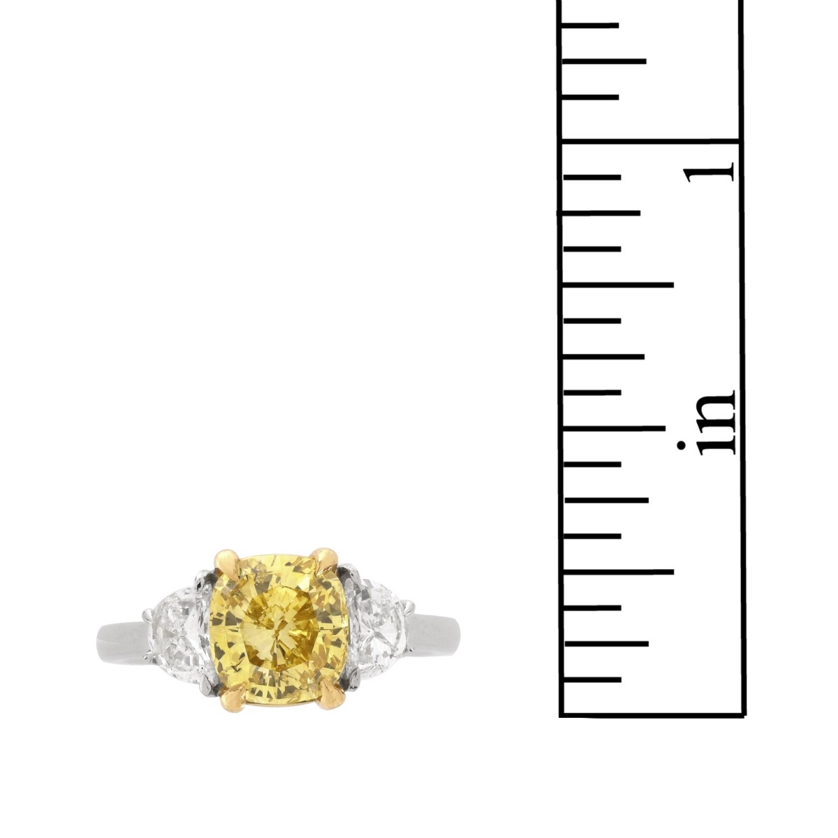 GIA Certified 1.53 Carat Cushion Cut Fancy Vivid Yellow Diamond and 18 Karat White Gold Engagement Ring accented with .43 Carat TW Two Half Moon Cut Diamonds. Yellow diamond SI2 clarity. Accent diamonds F color, VS clarity. Stamped 18K. Ring size 5-1/2. Approx. weight: 4.7 grams. GIA Report 5191072911 dated 2/1/2018 to accompany this Lot. Condition: Very good condition. Estimate: $13000.00 - $18000.00 Domestic Shipping: $30.00