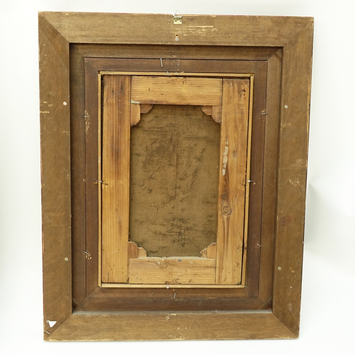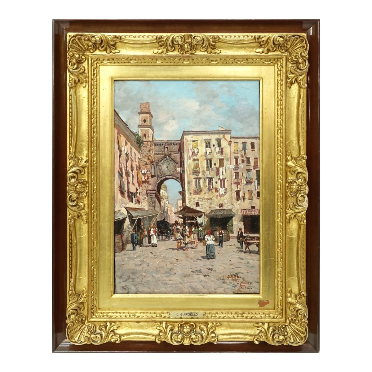 Carmine Giardiello, Italian (1871 - 1916) Oil on Canvas "View of a Marketplace" Signed Lower Right. Tag affixed to frame. Measures 16-1/2" H x 11-1/4" W, frame measures 24-3/4" H x 19-3/4" W. Condition: Normal craquelure overall good condition Estimate: $500.00 - $700.00 Domestic Shipping: $125.00