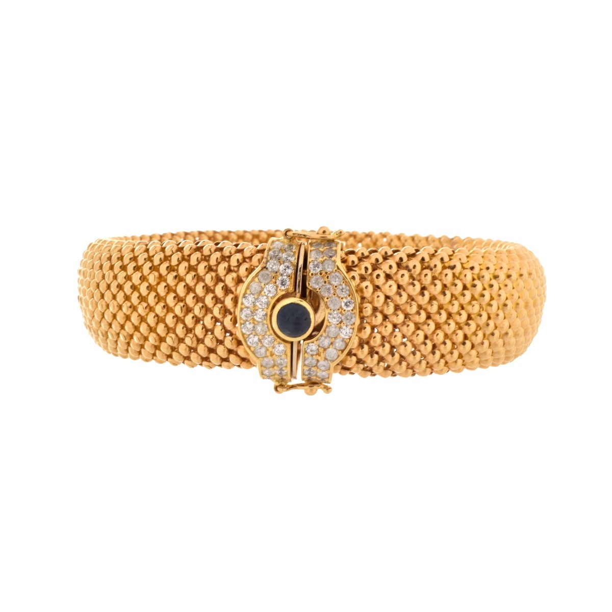 Vintage 14 Karat Yellow Gold Flexible Stretch Mesh Link Bracelet with Cabochon Sapphire and Pave Set Diamond Accented Clasp. Stamped 585. Measures 7-1/8" L, 3/4" W. Approx. weight: 28.2 grams. Condition: Very good vintage condition. Estimate: $700.00 - $900.00 Domestic Shipping: $32.00