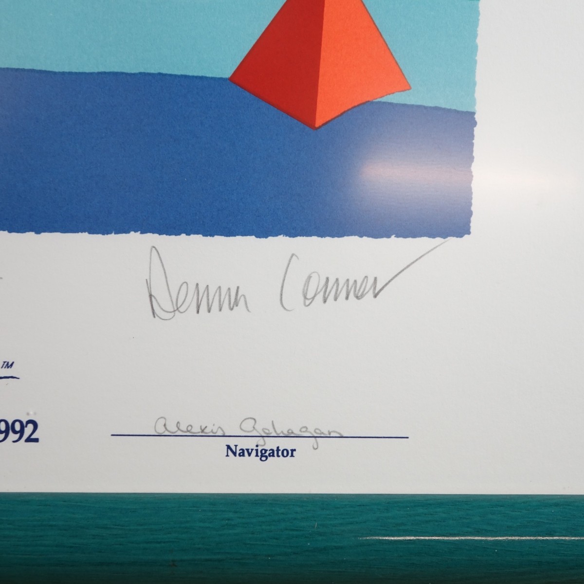Pair Dennis Conner II (1942- ) Modern Serigraph , from the Stars & Stripes America Cup Defense 1992 series, "Rounding the Mark" and "Hauling the Mail", signed & numbered 86/300 in pencil Dennis Conner and two of his team mates, measures sight 25" H x 18" W frame 36" H x 29" W Condition: Good condition, wear consistent with age and history. Estimate: $200.00 - $400.00 Domestic Shipping: Third Party