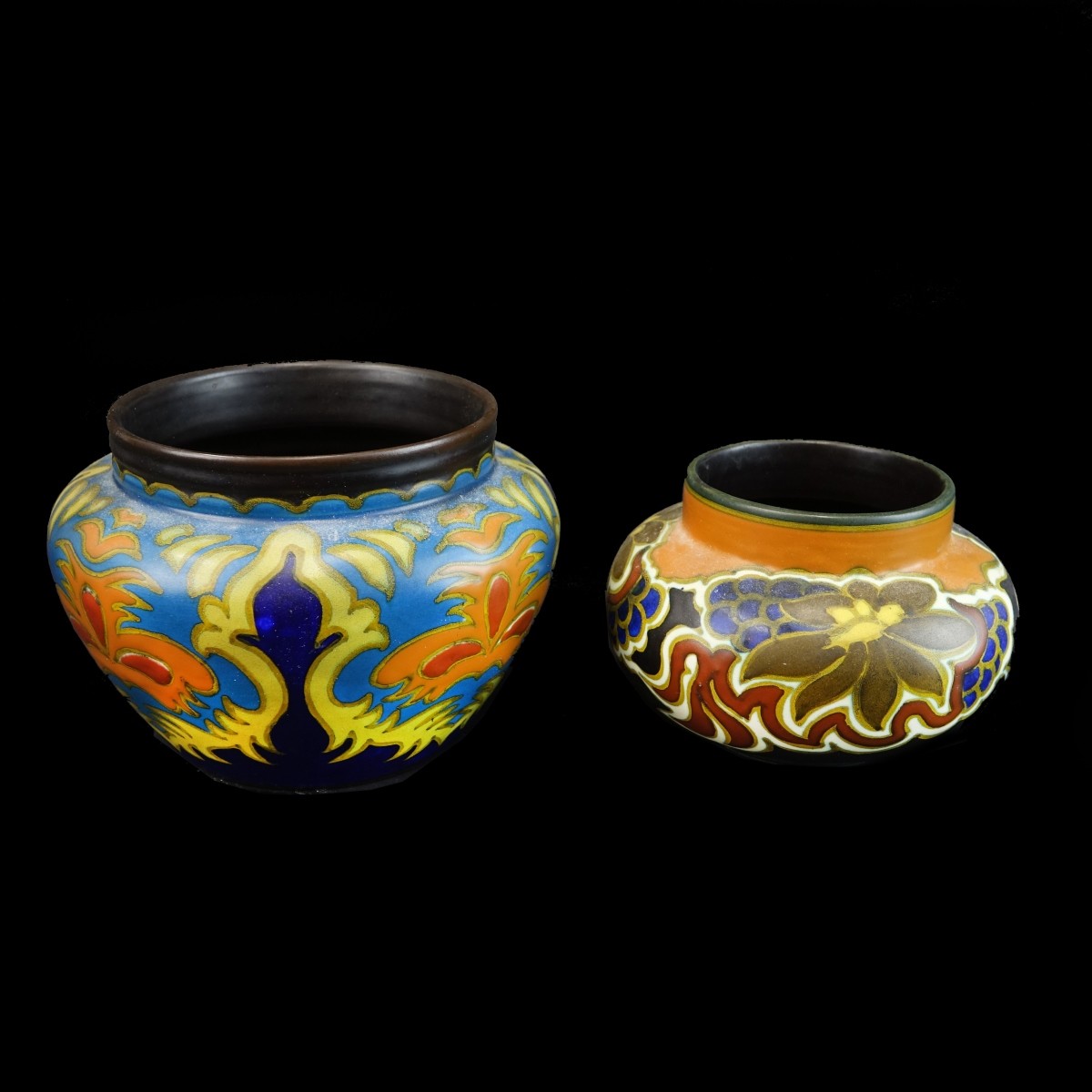 Collection of Two (2) Antique Gouda Polychrome Pottery Vases. Signed, numbered and titled to the base. Floral patterns on each. Largest measures 5-3/4" H x 8" W, other measures 4-1/2" H x 6-1/2" W. Condition: Good condition Estimate: $100.00 - $300.00 Domestic Shipping: $72.00