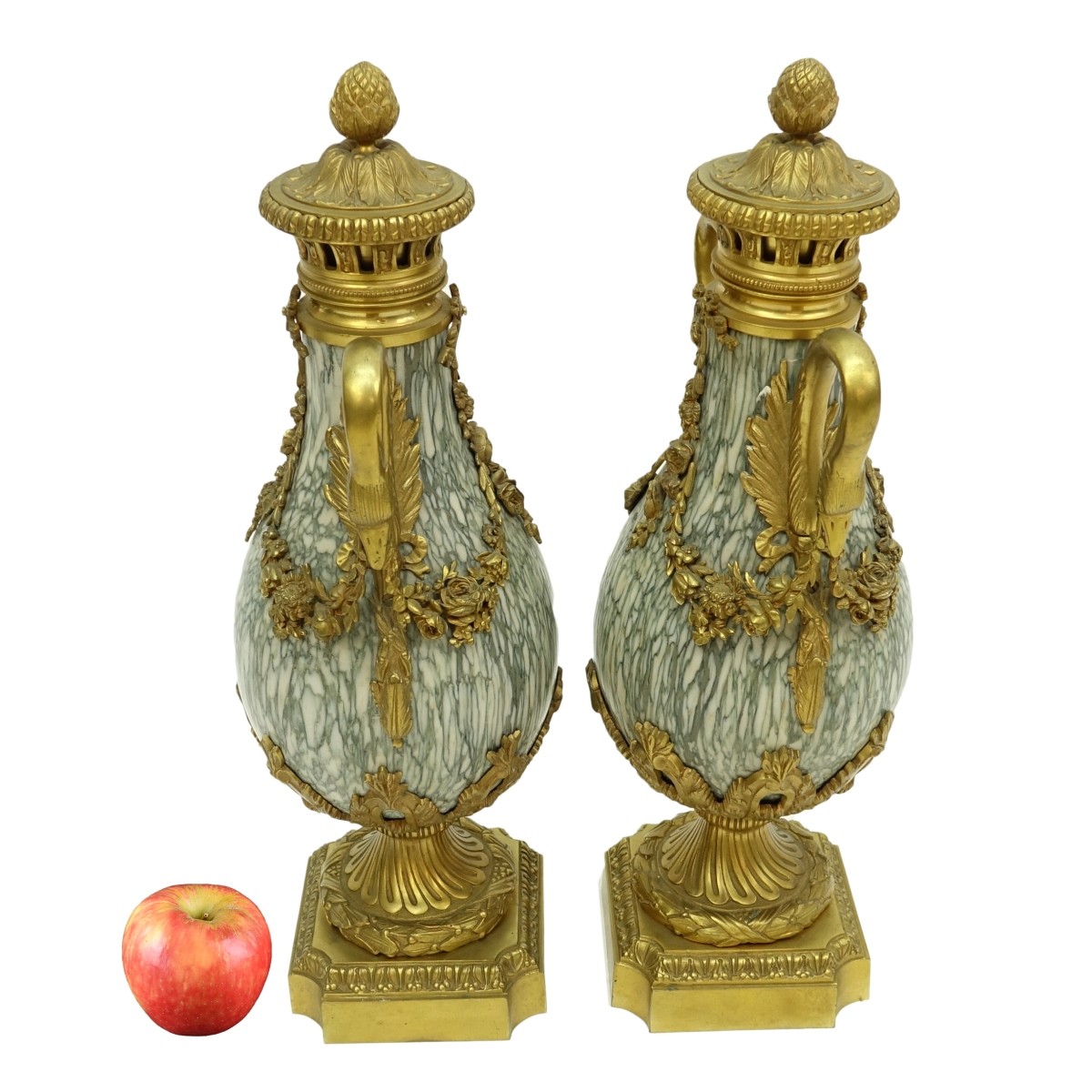 Pair of Antique French Louis XVI Style Marble and Gilt Bronze Cassolettes. Pine cone finial with garlands foliage and swan handles, stands square plinth. Measures 21-1/2" H x 8" W. Condition: Good condition Estimate: $800.00 - $1200.00 Domestic Shipping: Third party