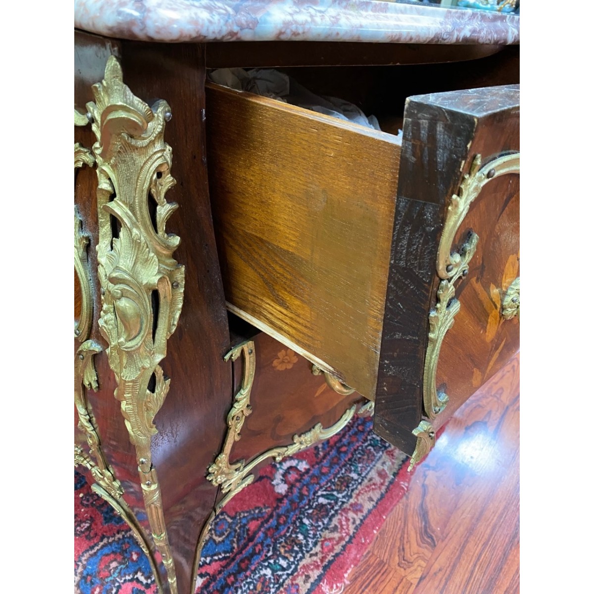 Antique French Louis XVI Style Bronze Mounted Marble Top Chest of Drawers. Floral Marquetry design on the drawers and side panels, foliage form handles, two large sliding drawers, and stands on tapering feet. Measures 34-1/2" x 47-1/2" x 22-1/4". Condition: Normal surface scuffs near the legs, overall good condition Estimate: $700.00 - $900.00 Domestic Shipping: Third party