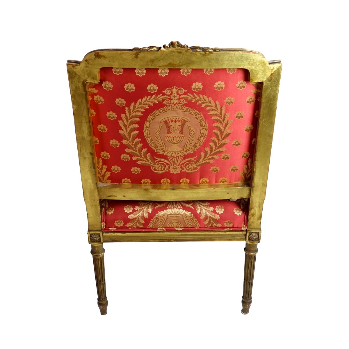 Early to mid 20th Century French Louis XVI Style Carved and Upholstered Armchair with matching Pillow. Foliage and wreath motif, decorative finial, stands on fluted tapering legs. Measures 37-1/2" x 24-1/2". Condition: Small stain to the upholstery, rubbing to surface Estimate: $200.00 - $400.00 Domestic Shipping: Third party