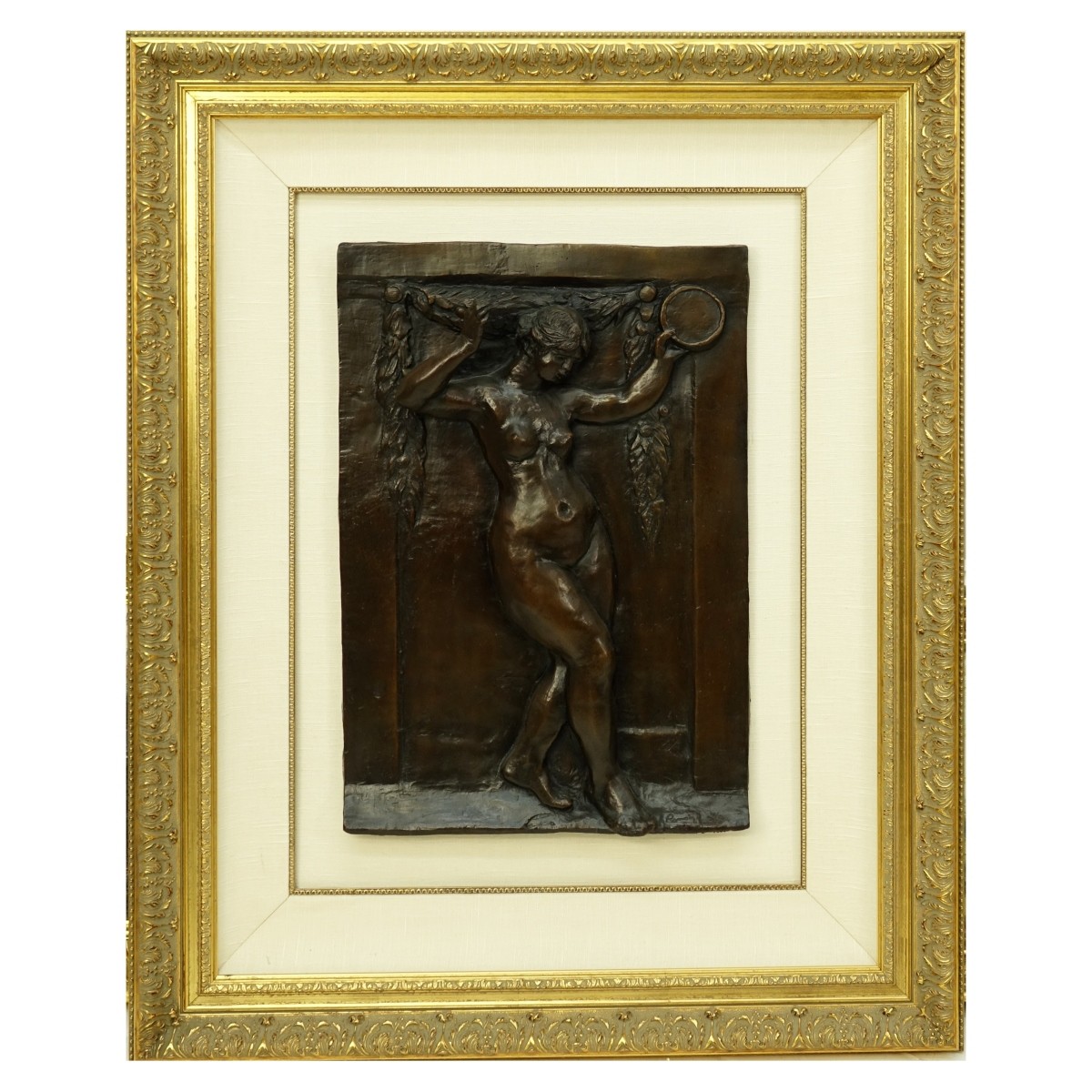 After: Pierre Auguste Renoir, French (1841-1919) Bronze relief "Dancer With Tambourine 1" Signed and numbered 39/99. Produced by the Hoka-Hey Foundry, Dublin, Texas, together with a Certificate of Authenticity signed by Madame Louise Renoir attesting that the original plaster cast was in Renoir's home at Cagnes, France and later owned by Renoir family members. Measures 24" H x 16-1/2 " W x 4" D, frame measures 41-1/2" x 33-5/8". Condition: Very good condition. Estimate: $2000.00 - $3000.00 Domestic Shipping: Third party