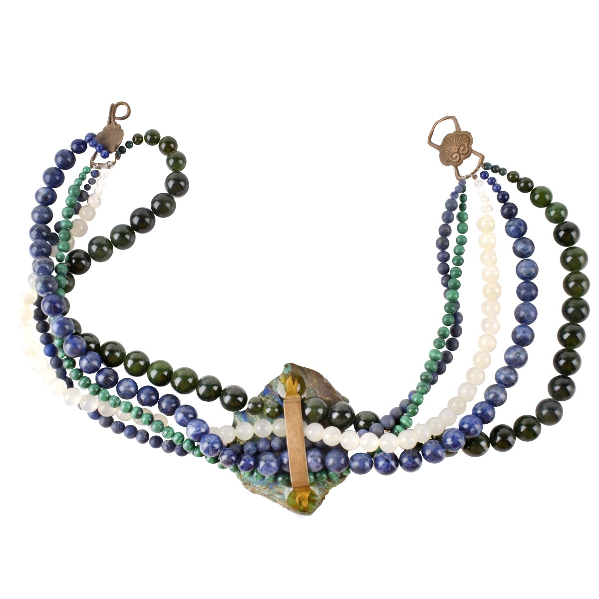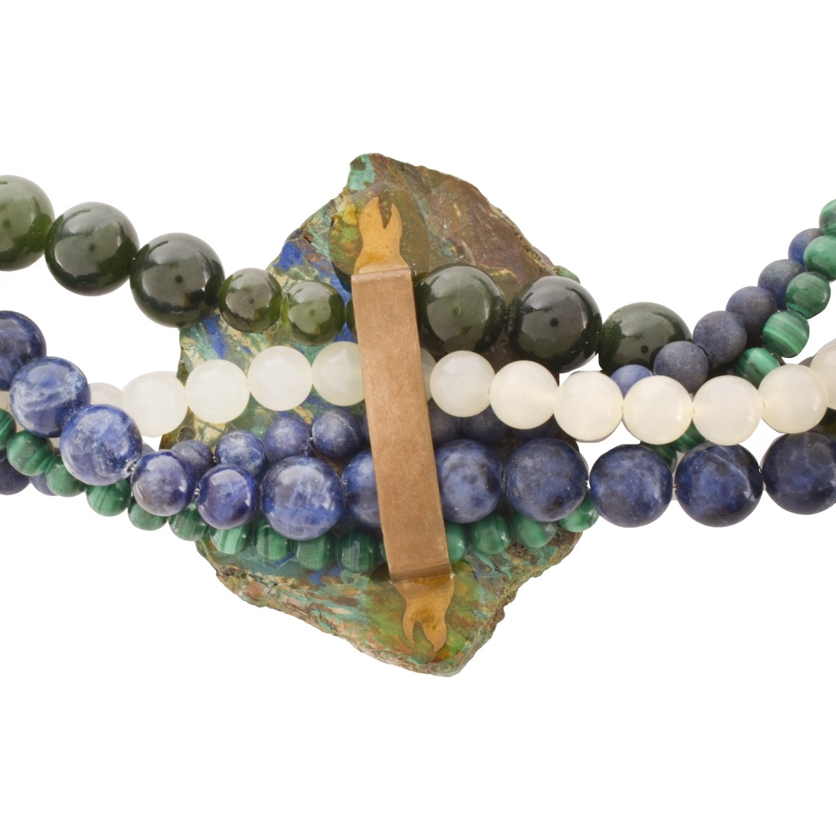 Vintage Stephen Dweck Five Strand Hardstone Bead Necklace with Azurite Pendant. Hardstones include nephrite jade, malachite, lapis lazuli, quartz and sodalite. Signed to clasp. Necklace measures 17" L, azurite pendant measures 2-1/2" x 2-1/4". Beads range from 4mm to 12mm. Approx. weight: 279.8 grams. Condition: Very good vintage condition Estimate: $100.00 - $150.00 Domestic Shipping: $32.00
