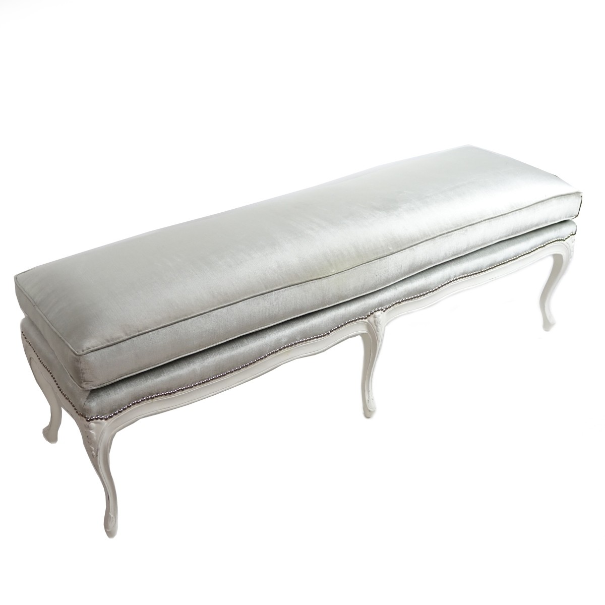 Contemporary Louis XV style Distress Painted Bench with Velvet Upholstery. Unsigned. Measures 21" H, 63-1/2" L, 18-1/2" D. Condition: Very good condition. Estimate: $200.00 - $300.00 Domestic Shipping: Third party