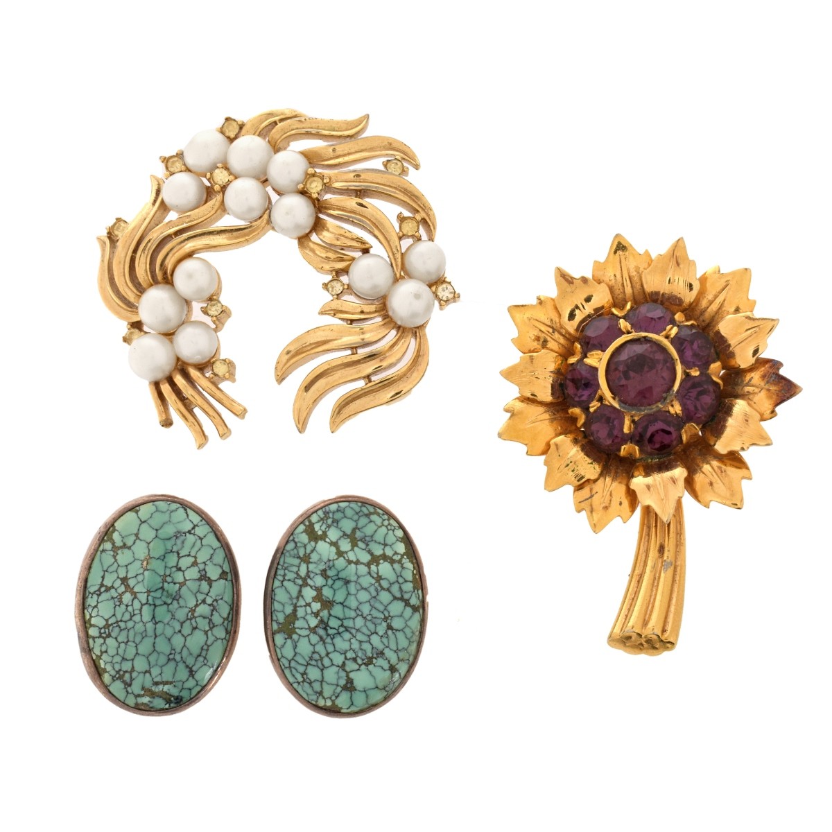 Vintage Stephen Dweck Sterling Silver and Turquoise Earrings and Two Costume Brooches. Earrings signed and stamped 925. Brooch with faux pearls stamped Trifari. Pendant brooch with faux amethysts stamped Mazer. Earrings measure 1" x 3/4". Trifari brooch measures 1-3/4" x 1-5/8". Earrings weigh: 18.3 grams. Condition: Good vintage condition. Earrings need cleaning. Estimate: $50.00 - $100.00 Domestic Shipping: $30.00