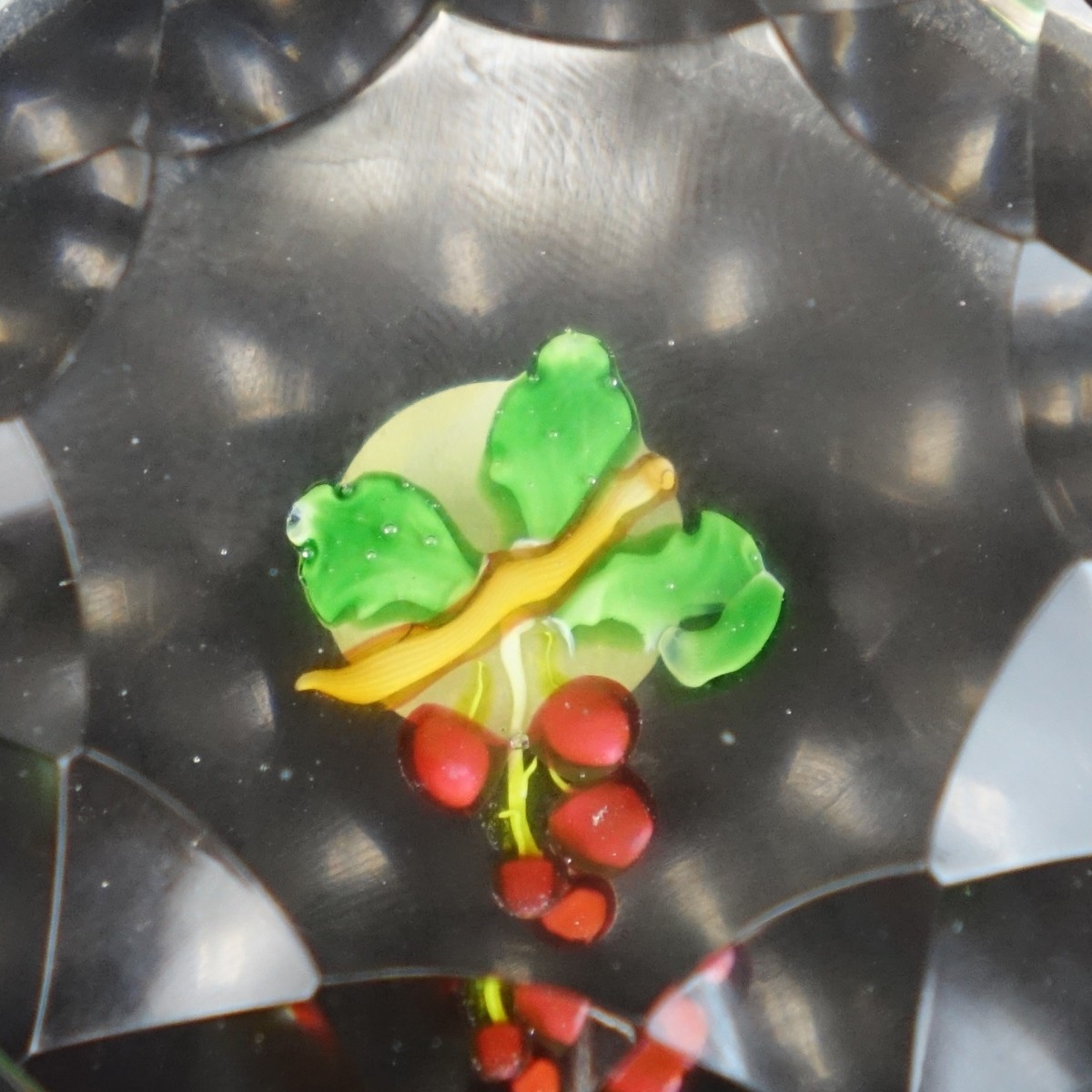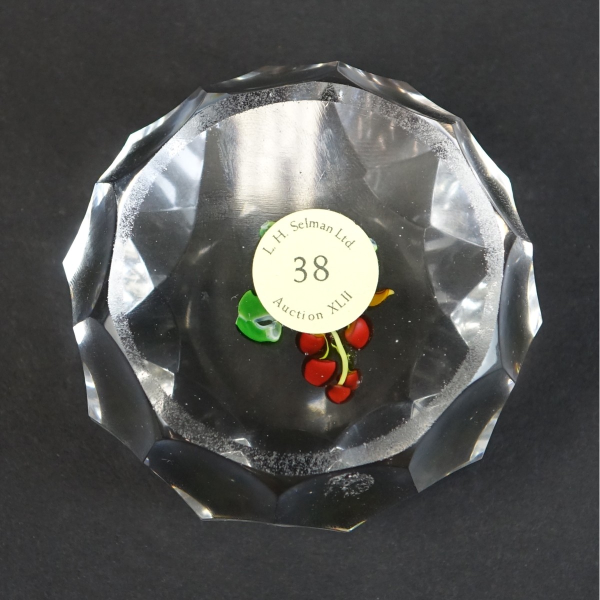Antique Saint Louis Painted Art Glass Paperweight. Multi faceted surface, painted cherry branch interior. L.H. Selman auction label still attached. Measures 1-3/4" H x 3" W. Condition: Good condition Estimate: $500.00 - $2500.00 Domestic Shipping: $32.00