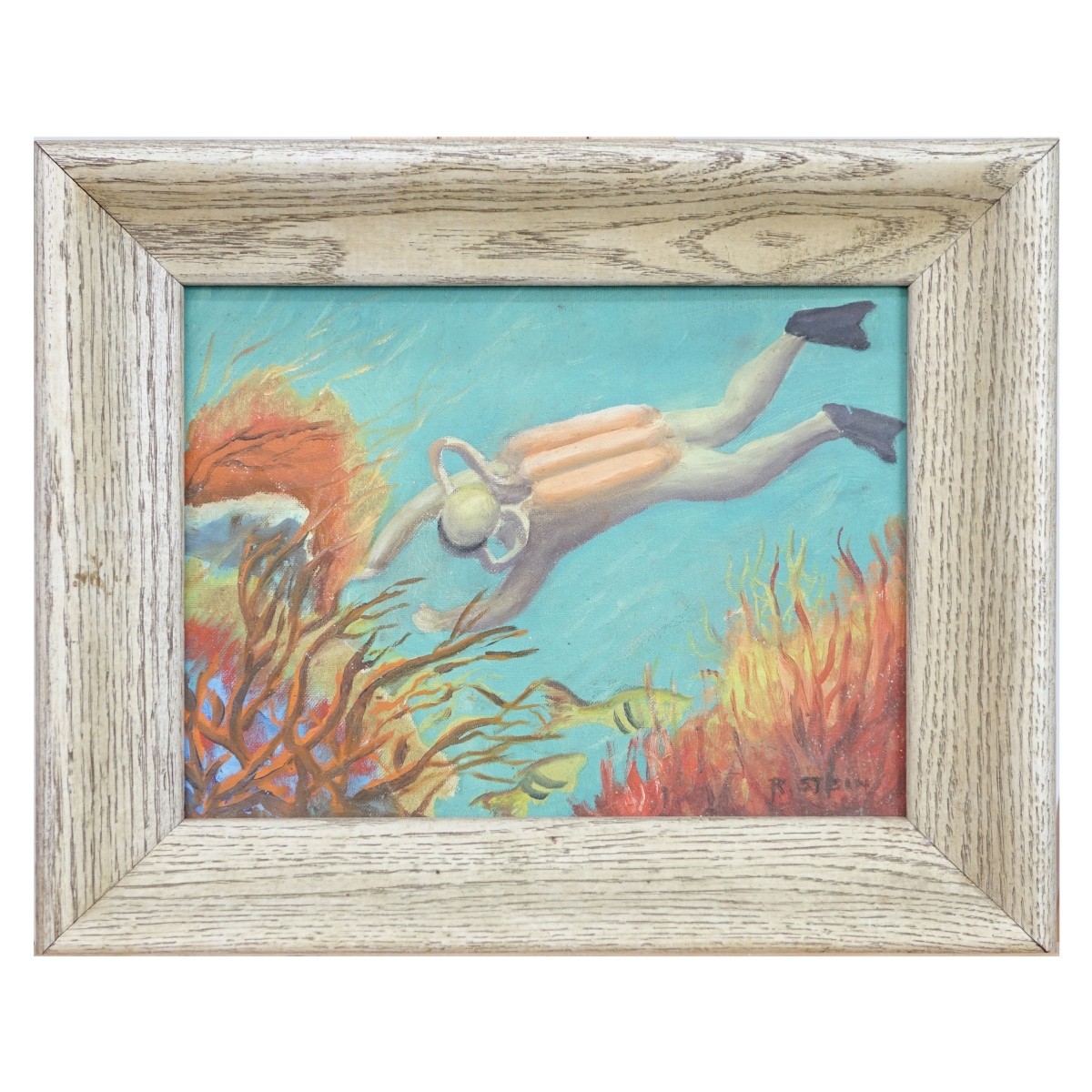 20th Century Oil on Board "Scuba Diver" Signed R. Stein Lower Right. Measures 9" H x 12" W, frame measures 12-5/8" H x 15-1/2" W. Condition: Good condition Estimate: $50.00 - $150.00 Domestic Shipping: $78.00