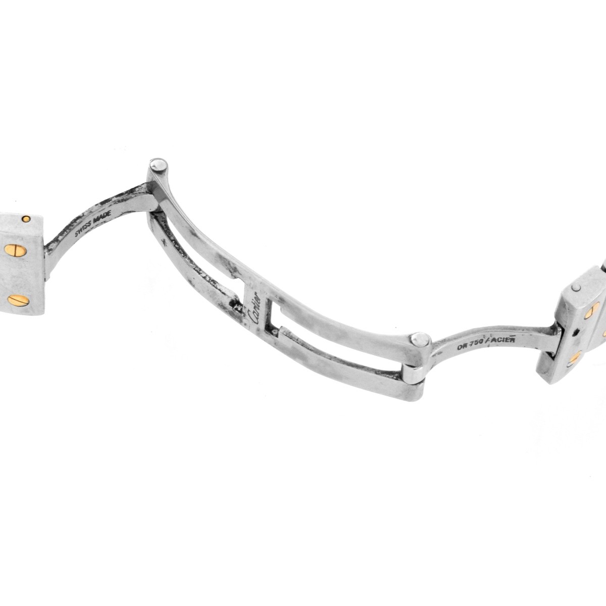 Vintage Cartier Santos Stainless Steel and 18 Karat Yellow Gold Bracelet Watch with Quartz Movement. Case measures 30.5mm. Bracelet measures 7-1/2" L. Stamped 750/Acier. Approx. weight: 92.5 grams. No box, no papers. Condition: Used condition. Surface wear and scratches. Stretched bracelet. Second hand moves irregularly. Needs servicing. Running. Please note the gallery does not warranty the running condition or watches. Estimate: $1000.00 - $1500.00 Domestic Shipping: $30.00