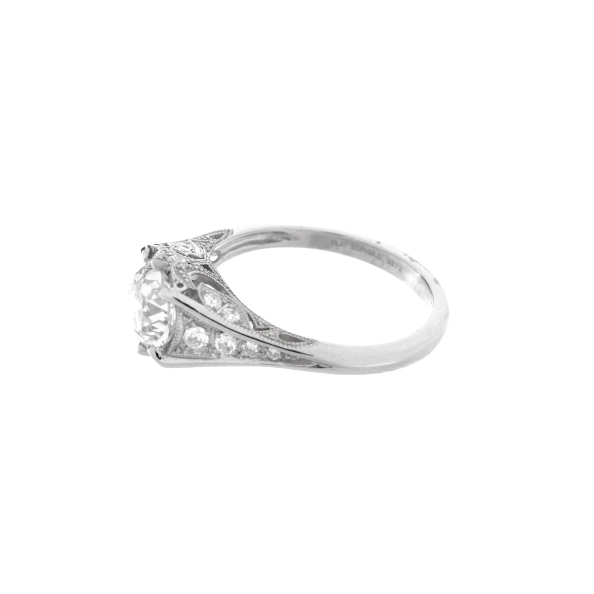Art Deco style Diamond and Platinum Ring. Set in the center with a 1.26 carat old European cut diamond, I-J color, VS2 clarity. Accented with .26 carat TW round brilliant cut diamonds, E-F color, VS1-VS2 clarity. Stamped Plat. Ring size 6-1/4. Approx. weight: 4.40 grams. Condition: Very good condition. Estimate: $1000.00 - $5000.00 Domestic Shipping: $28.00