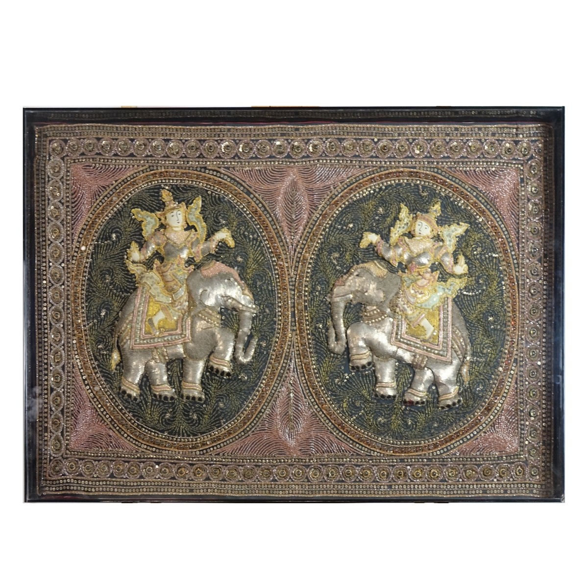 Large Thai Hand Embroidered Kalaga Tapestry in Shadowbox Frame. Depicts a pair elephant riders, sequins and threaded embellishments. Measures 26-1/2" H x 39-1/4" W. Condition: Good condition Estimate: $50.00 - $100.00 Domestic Shipping: Third party