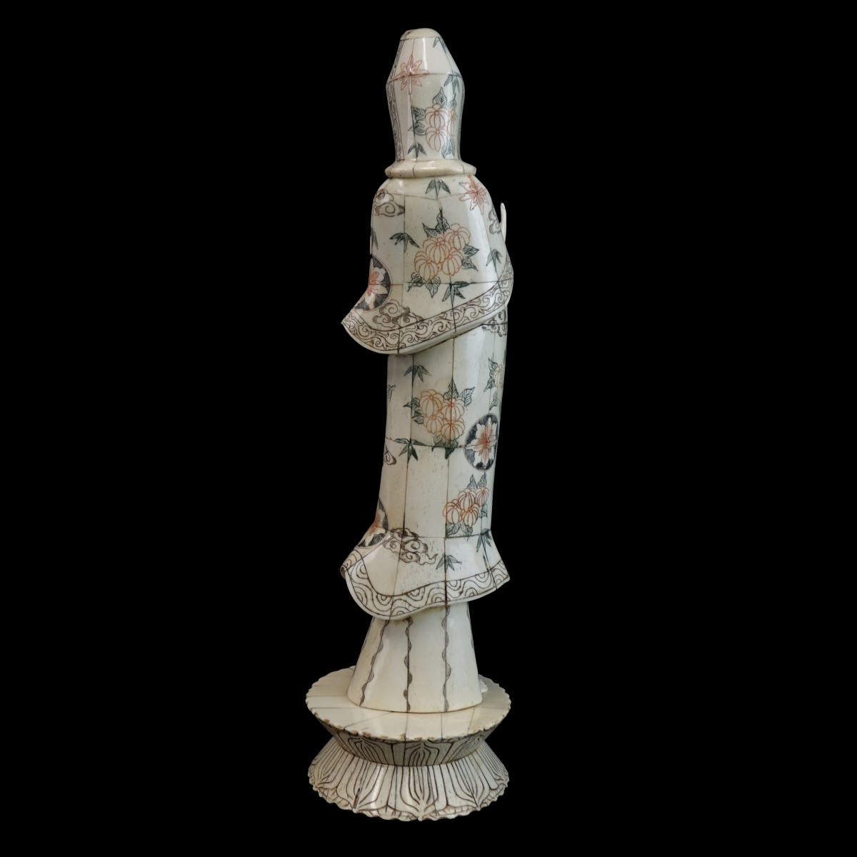 Large Chinese Polychrome Carved Bone Figure of Guanyin. Unsigned. Measures 19" H x 5-1/2" W. Condition: Good condition Estimate: $200.00 - $400.00 Domestic Shipping: Third party