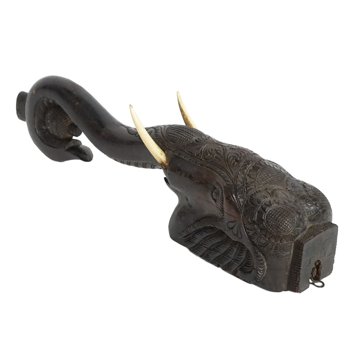 Large Thai Wood Carved Elephant Wall Hanging Sculpture. Elaborate carved relief en surface, faux bone tusks. Measures 23-1/2" H x 5-1/4' W. Condition: Typical rubbing and surface scuffs otherwise good condition Estimate: $50.00 - $150.00 Domestic Shipping: Third party