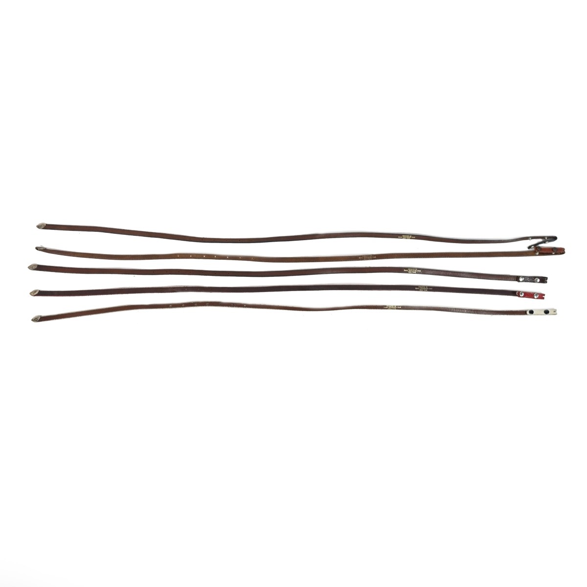 Five Vintage Barry Kieselstein-Cord Leather Belts with Silver Tips together with a Silver Buckle and Two Belt Loops. Signed. Buckle measures 1-1/4" x 1-1/4". Belts measure 42" L, 7/16" W. Approx. weight of buckle and two loops: 18.03 grams. Condition: Belts in used / "As Is" condition. Silver parts, good vintage condition, need cleaning. Estimate: $50.00 - $150.00 Domestic Shipping: $40.00