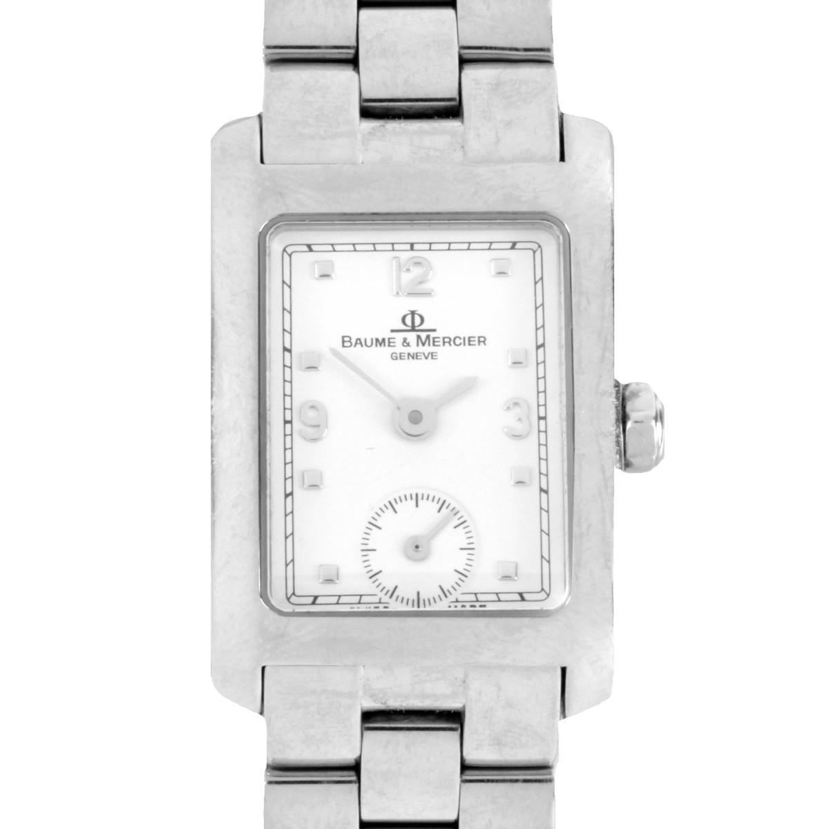Lady's Vintage Circa 1998 Baume & Mercier Stainless Steel Bracelet Watch with Quartz Movement, White Dial. Case measures 33mm x 20mm. Extra bracelet links. With papers and original receipt. Condition: Good vintage used condition. Light surface wear and scratches from normal use. Likely needs a battery. Please note the gallery does not warranty the running condition of watches. Estimate: $100.00 - $300.00 Domestic Shipping: $30.00