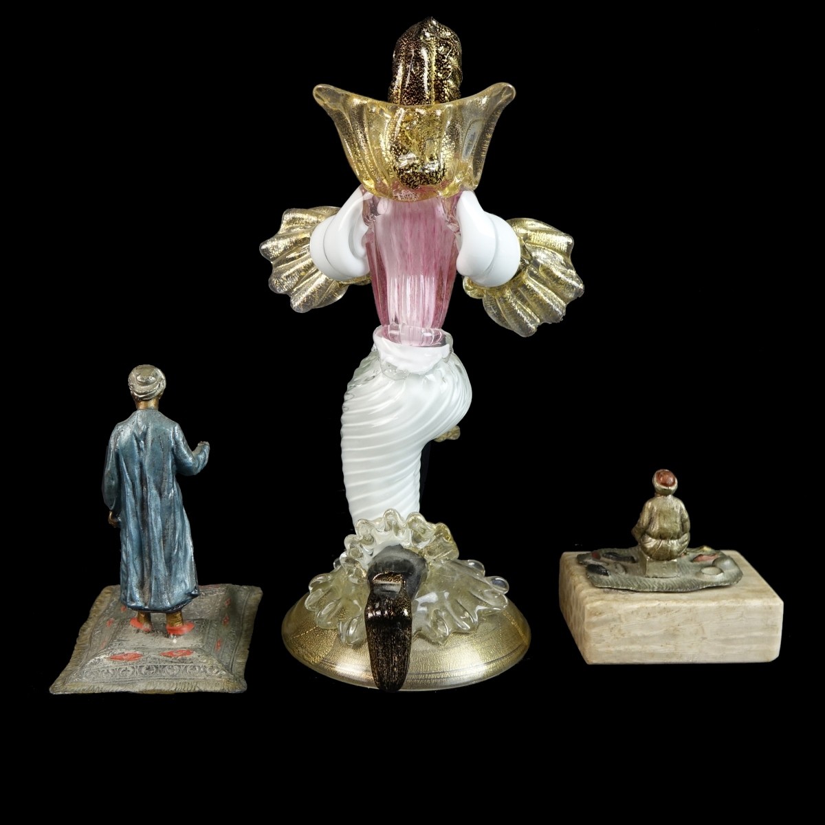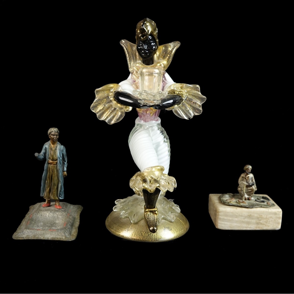 Grouping of Three (3) Vintage Assorted Figurines. Includes two cold painted spelter figurines together with with a Murano art glass standing figurine. Spelter figures are marked, one Germany and one Austrian. Tallest measures 10" H, smallest measures 3-1/8" H x 3-1/4" W. Condition: One spelter figure is missing one hand, smaller spelter figurine needs to be glued to the base Estimate: $50.00 - $100.00 Domestic Shipping: $62.00