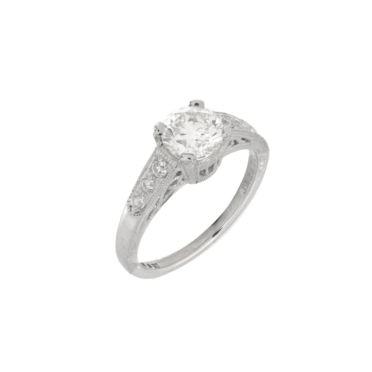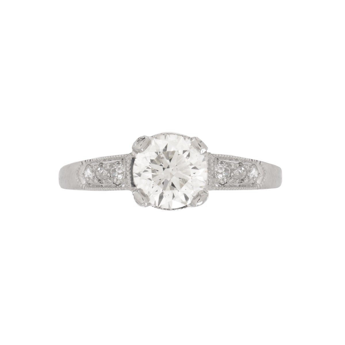Art Deco style Diamond and Platinum Ring. Set in the center with a 1.01 carat round brilliant cut diamond, G-H color, SI1 clarity. Accented with .16 carat TW round brilliant cut diamonds E-F color, VS1-VS2 clarity. Stamped Plat. Ring size 6-1/4. Approx. weight: 4.67 grams. Condition: Very good condition. Estimate: $1000.00 - $5000.00 Domestic Shipping: $28.00