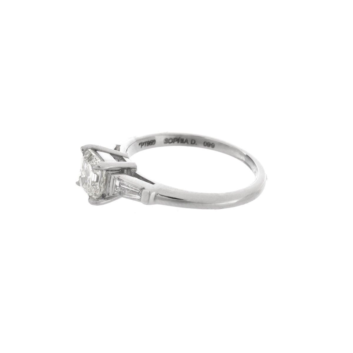 Diamond and Platinum Ring. Set in the center with a .93 carat square cut diamond, J color, VVS1 clarity. Accented with .10 carat TW two tapered baguette cut diamonds, E-F color, VS1-VS2 clarity. Stamped Pt950. Ring size 6-1/4. Approx. weight: 4.20 grams. Condition: Very good condition. Estimate: $1000.00 - $5000.00 Domestic Shipping: $28.00