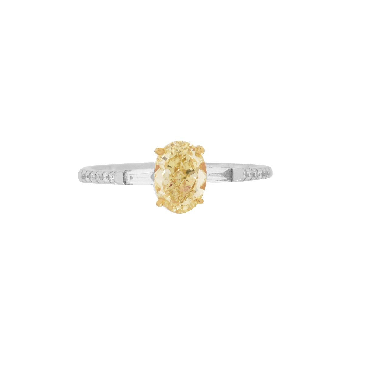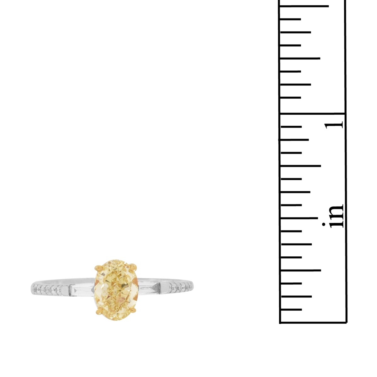 GIA Certified 1.0 Carat Oval Cut Fancy Yellow Diamond, .15 Carat TW Baguette and Round Brilliant Cut Diamond and 18 Karat White Gold Ring. Stamped 18K. Ring size 7. GIA report 5171327181 to accompany this lot. Approx. weight: 2.81 grams. Condition: Very good condition. Estimate: $1000.00 - $5000.00 Domestic Shipping: $28.00