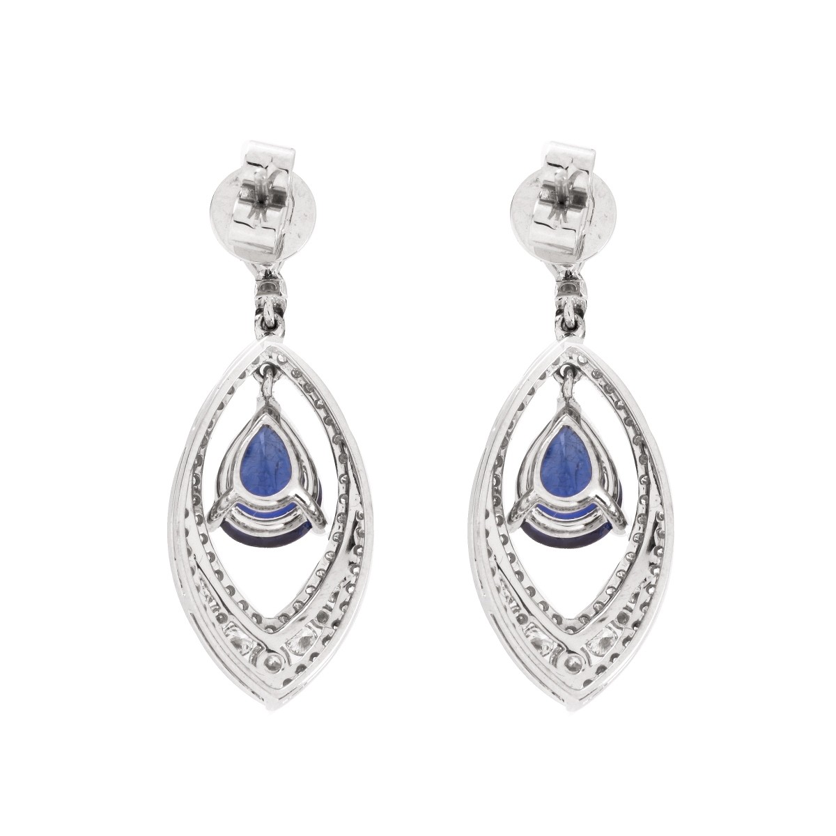 3.84 Carat TW Two Pear Shape Sapphire, 1.27 Carat TW One Hundred Fifty Four Pave Set Round Brilliant Cut Diamond and 18 Karat White Gold Pendant Earrings. Sapphires with vivid blue color. Diamonds E-F color, VS1-VS2 clarity. Stamped 750. Measure 1-5/16" L, 1/2" W. Approx. weight: 8.47 grams. Condition: Very good condition. Estimate: $1000.00 - $5000.00 Domestic Shipping: $30.00