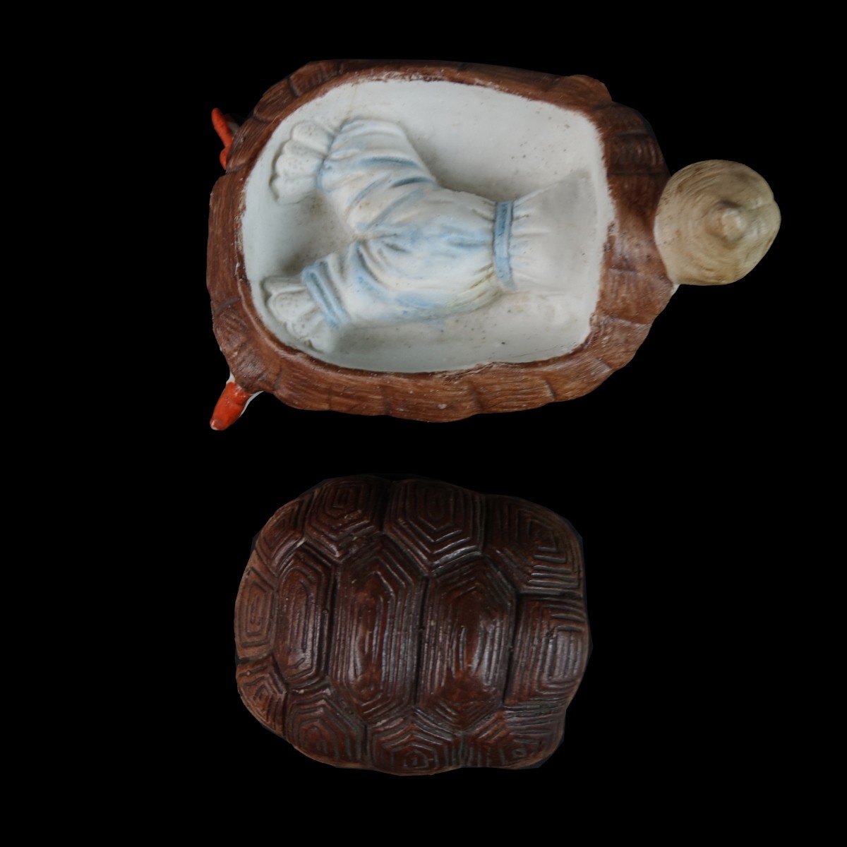 Lot of Five (5) Vintage Continental Bisque Bathing Beauties. Includes a turtle figure with removable top, and three seated figures. One has a stamp mark to the base others are unsigned. Tallest measures 4" H, turtle figure measures 2" H x 3-3/4" W. Condition: Good condition Estimate: $100.00 - $400.00 Domestic Shipping: $52.00