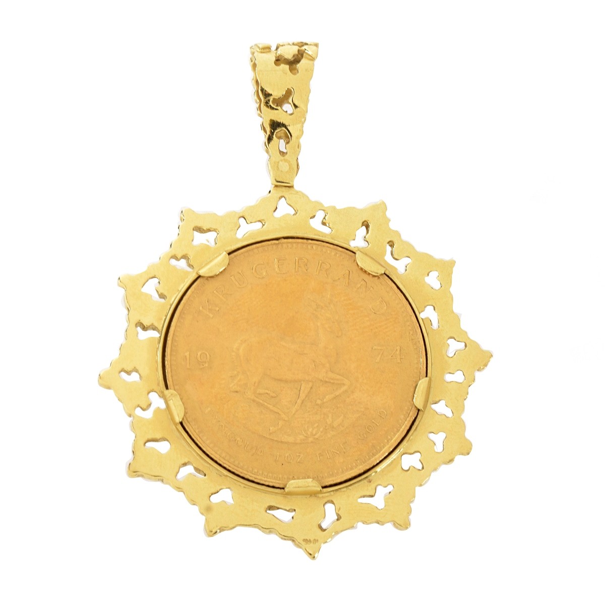 1974 1oz Fine Gold South African Krugerrand and 18 Karat Yellow Gold Pendant. Measures 2-5/8" L, 2" W. Total weight: 55.30 grams. Condition: Very good vintage condition. Light surface wear from normal use. Coin is not professionally graded. Estimate: $1000.00 - $4000.00 Domestic Shipping: $30.00