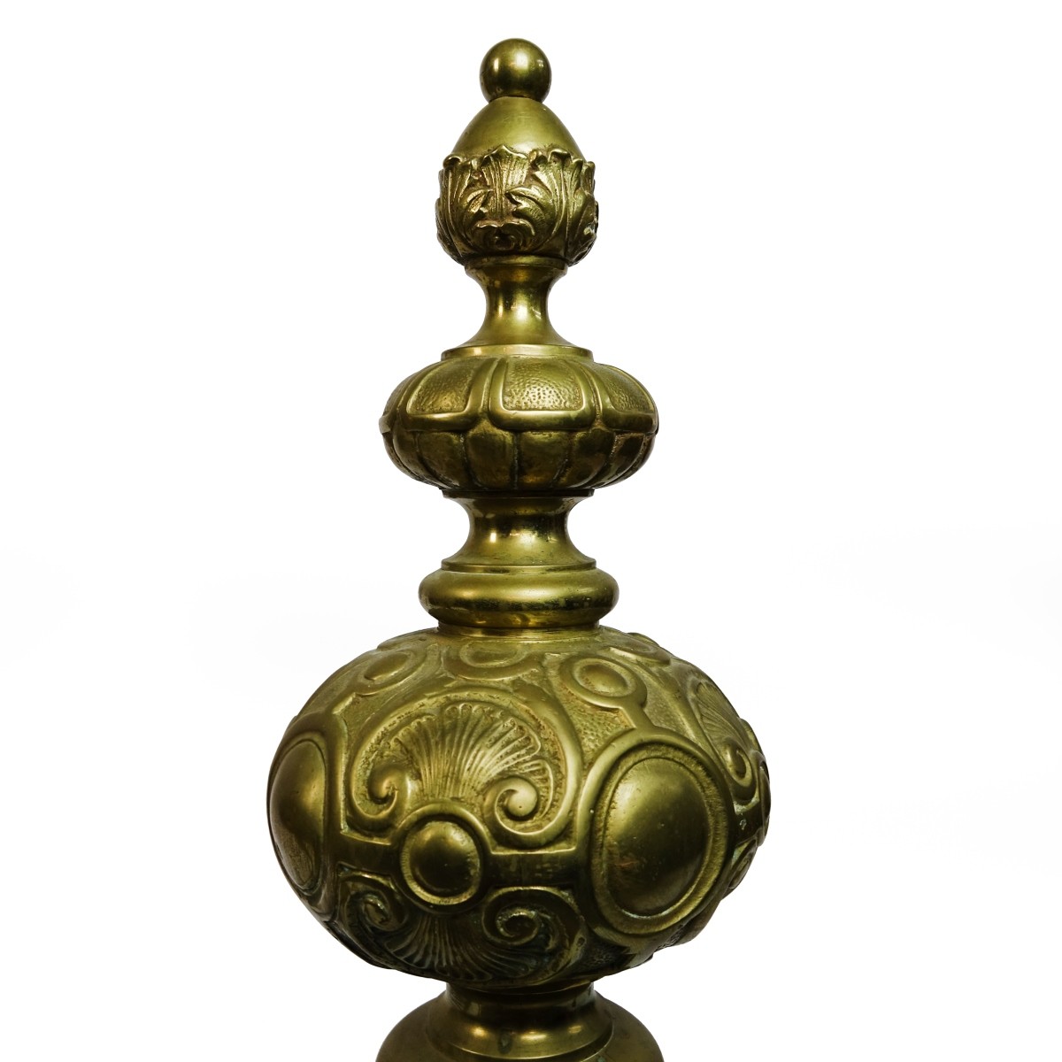 Pair Large Ornate Massive Griffin Fireplace Andirons, two winged griffins supporting balls with trailing flowers and scroll work down to claw feet, in brass, gold and Iron. unsigned, measures 34-1/4" H x 18" W x 29" including billet bar. Condition: Good condition, wear consistent with age and history. Estimate: $200.00 - $400.00 Domestic Shipping: Third Party