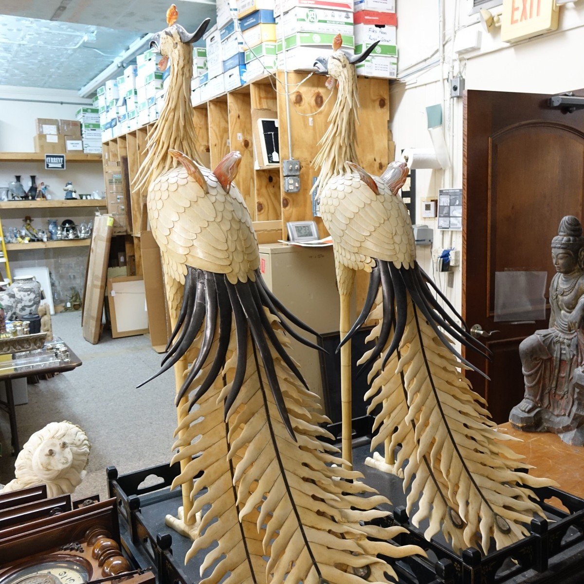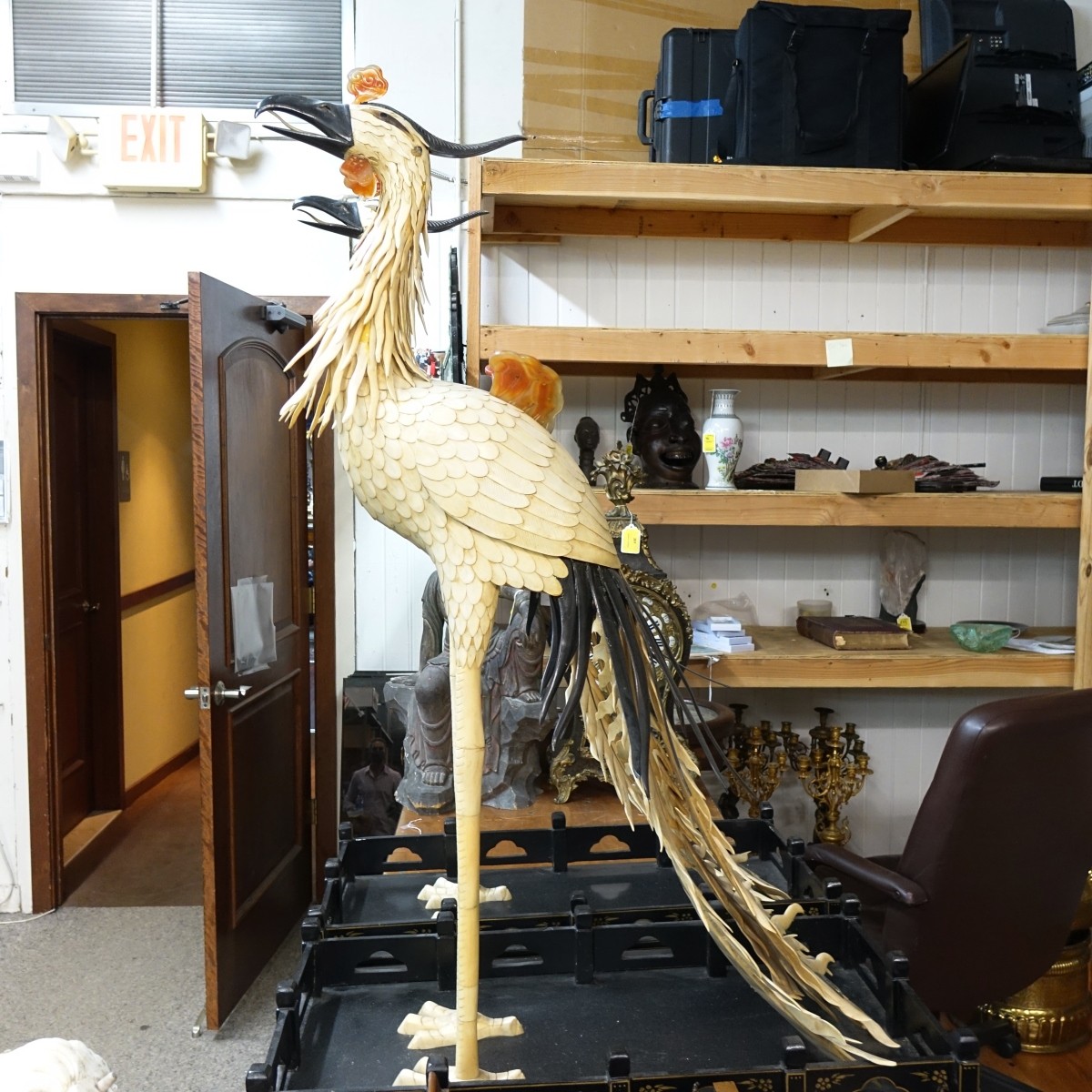 Monumental Pair of Chinese Tessellated Polychrome Carved Bone and Bone Veneer Phoenix Birds Accented with Carved Carnelian, Hardstone, Carved Horn and Mounted on Lacquer Wood Stands. Unsigned. Measure 48-1/2" H, 25" D, 16-1/2" W (at tail feathers). Stands measure 34" D x 18" W x 8" H. Condition: Small losses to a couple a neck feathers, overall very good condition. Estimate: $1500.00 - $2500.00 Domestic Shipping: Third party