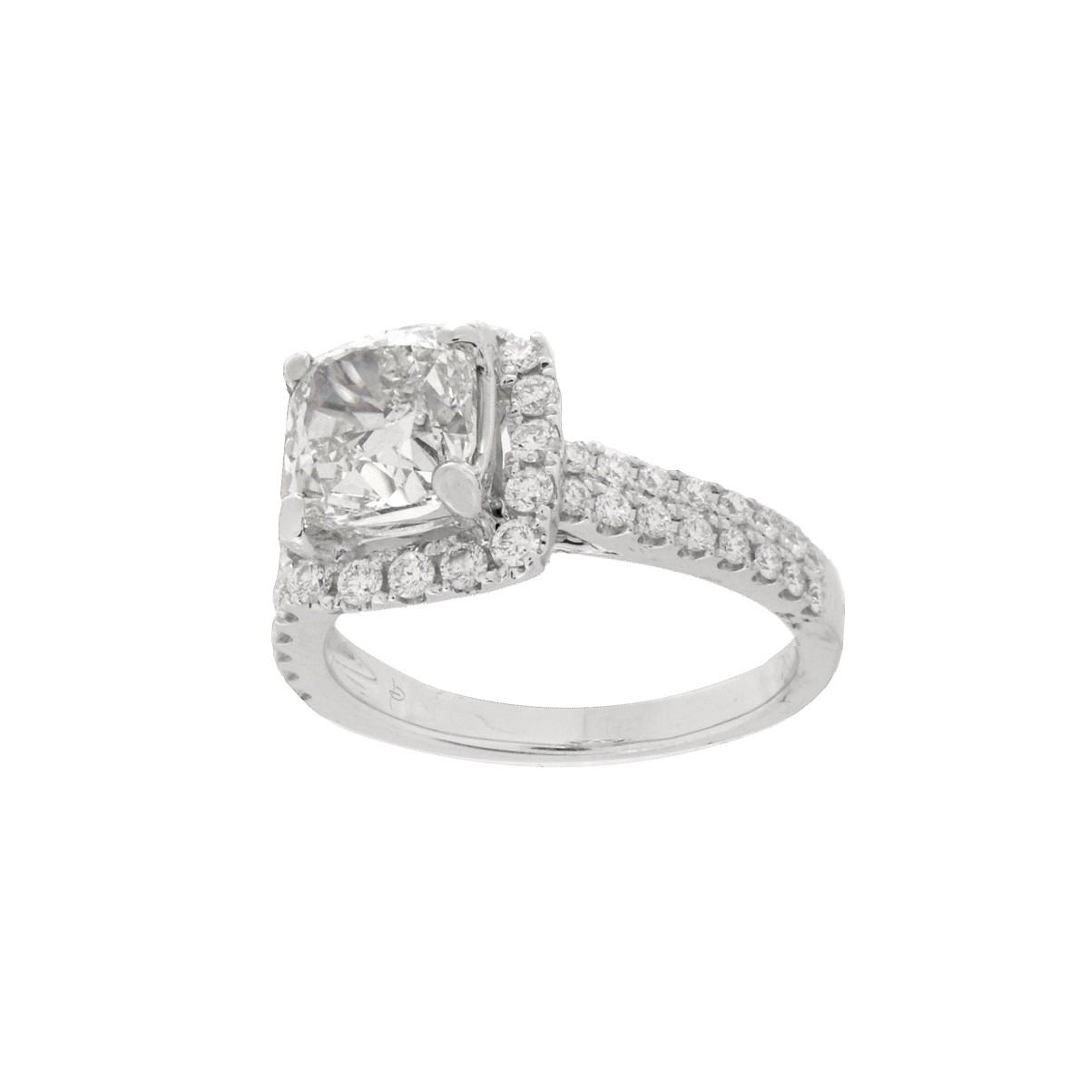 GIA Certified 2.02 Carat Cushion Cut Diamond and 18 Karat White Gold Engagement Ring. Accented throughout with round brilliant cut diamonds. Center diamond J color, VVS2 clarity, very good polish and symmetry. Stamped 18K. GIA inscribed. Ring size 5-1/2. Approx. weight: 4.4 grams. GIA report 520133180 dated 5/30/2019 to accompany this Lot. Condition: Very good condition. Please see GIA report for further information. Estimate: $9000.00 - $15,000.00 Domestic Shipping: $30.00