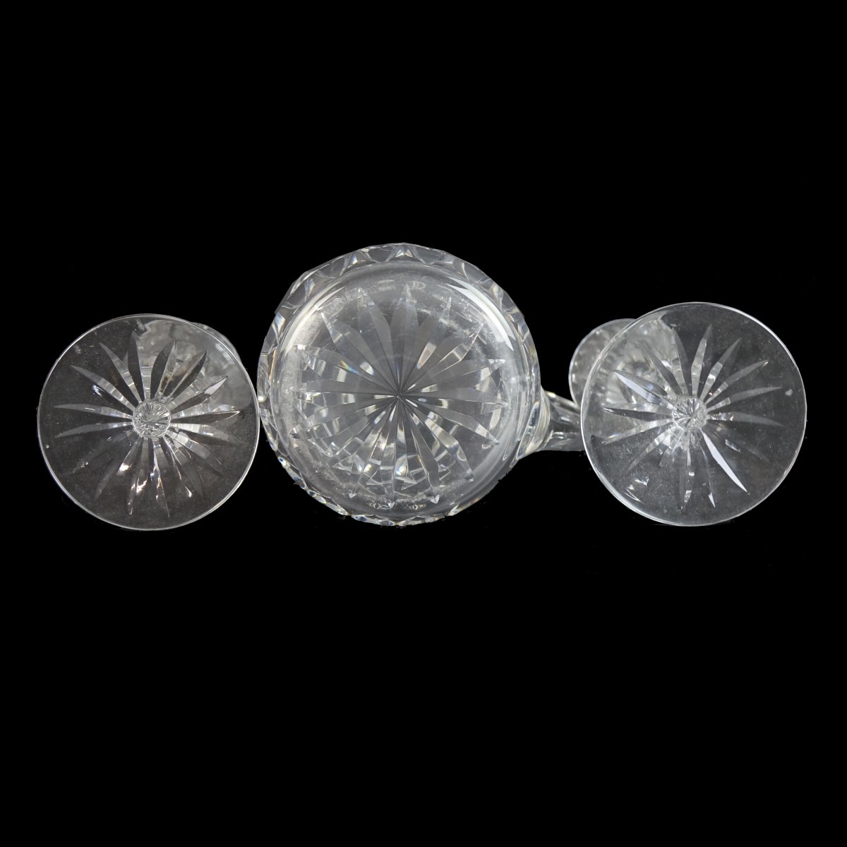 Grouping of Three (3) Waterford Crystal Tableware. Includes a "Lismore" pitcher together with a pair of candle holders. Signed. Pitcher measures 6-3/4" H, holders measures 5-5/8" H. Condition: Good condition Estimate: $50.00 - $150.00 Domestic Shipping: $68.00