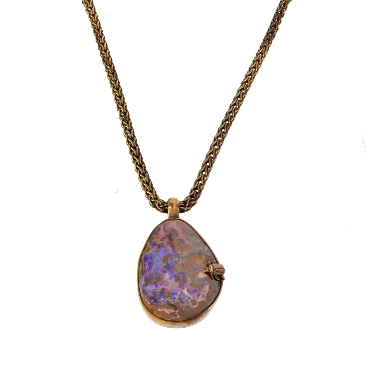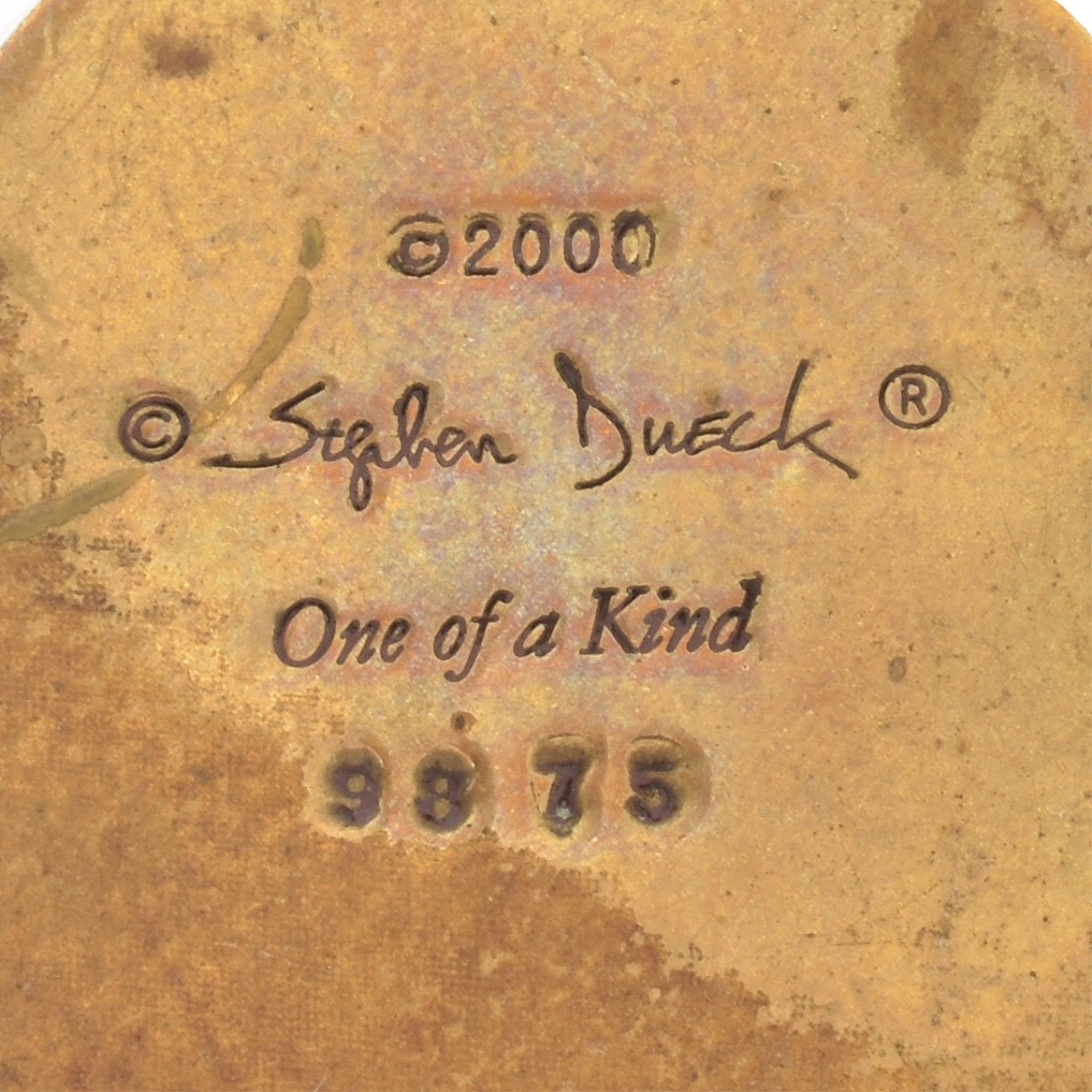 Vintage Circa 2000 Stephen Dweck "One of a Kind" Gemstone and Brass Pendant Necklace. Signed, and numbered 9875. Removable pendant measures 2-1/2" L, 1-1/2" W; chain measures 34-1/2" L. Approx. weight: 148.53 grams. Condition: Good vintage condition. Needs cleaning. Estimate: $200.00 - $500.00 Domestic Shipping: $34.00